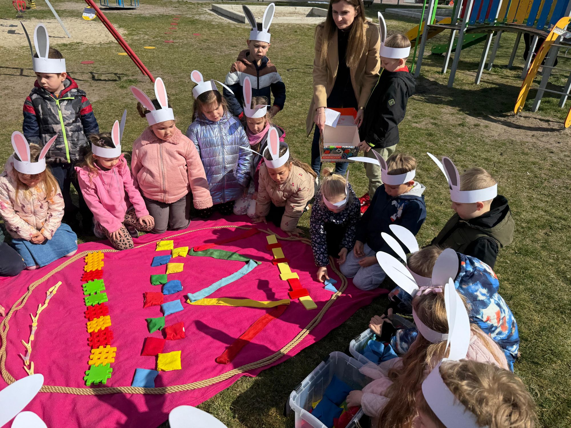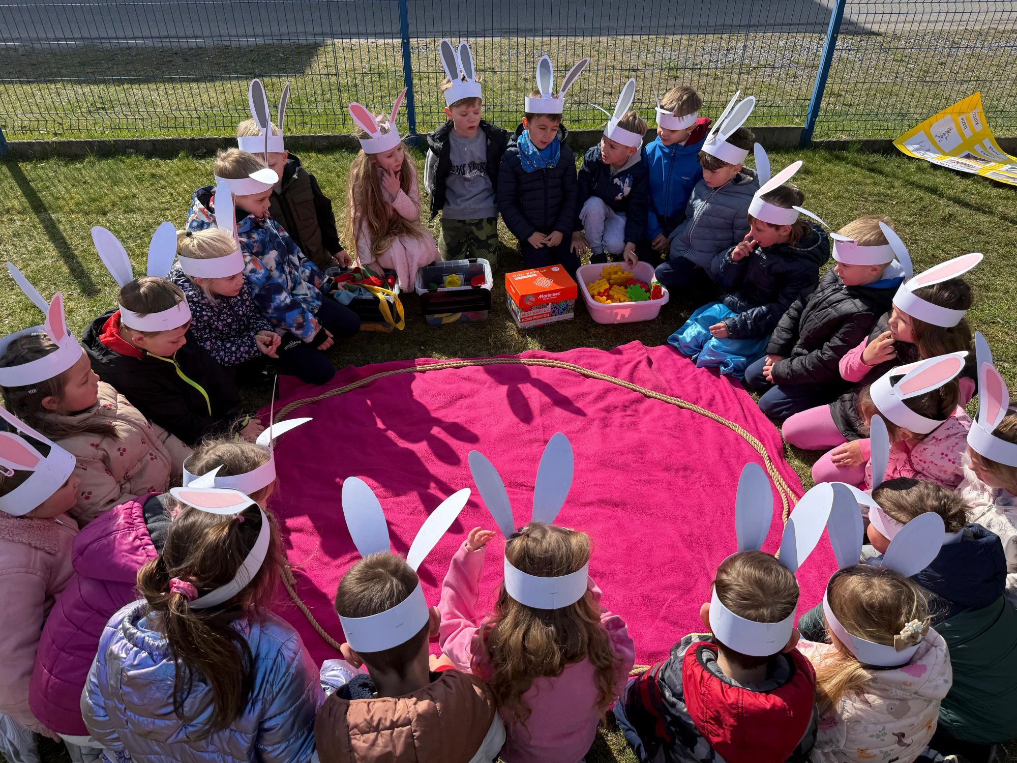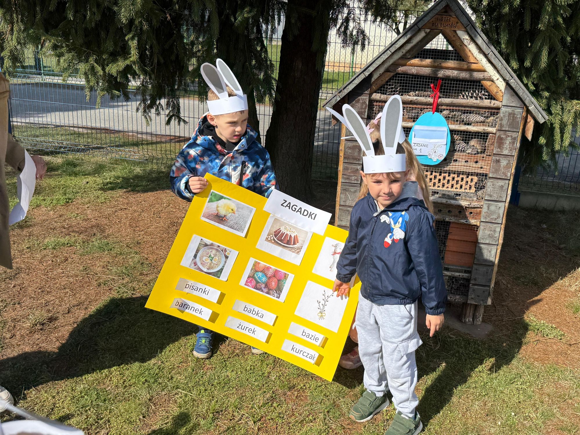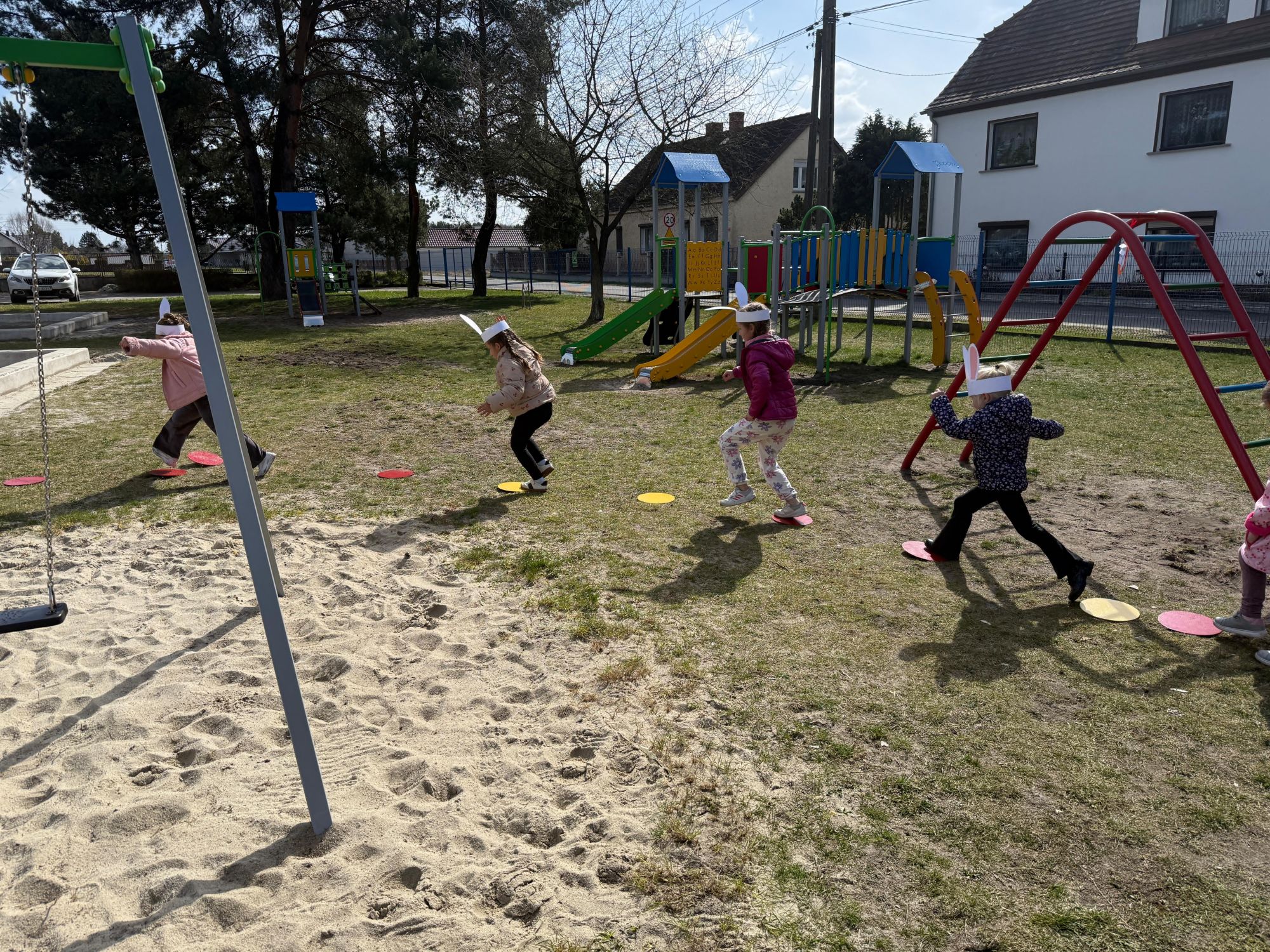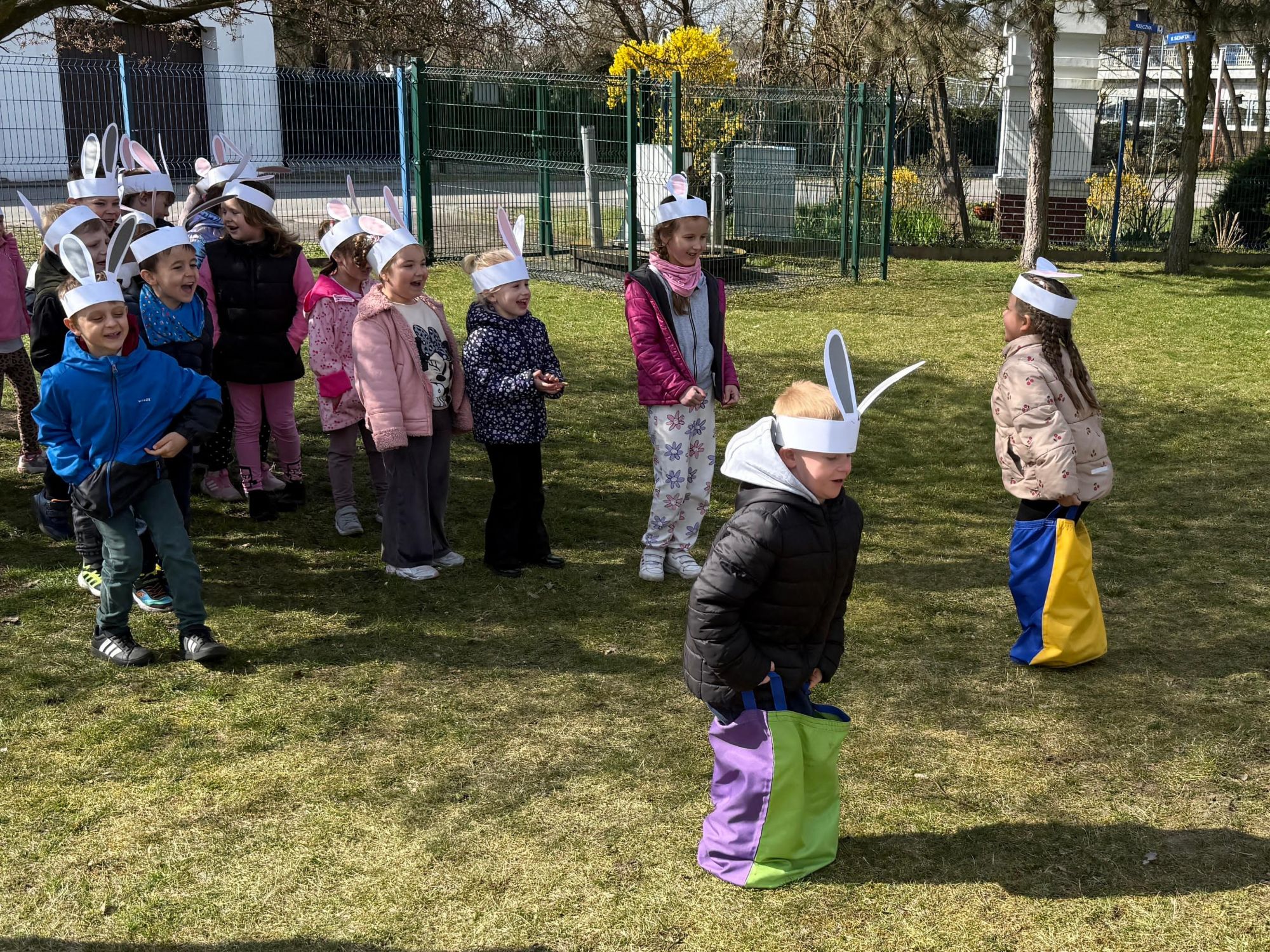 Każdego roku, tuż przed Świętami Wielkanocnymi, starszaków odwiedza wyjątkowy gość – Zajączek Wielkanocny. W tym roku, 1 kwietnia, dzieci już od samego rana z niecierpliwością wypatrywały jego przyjścia. Zaglądały przez okna i zastanawiały się, kiedy się pojawi. Po drugim śniadaniu ubrały się i założyły opaski z uszami zajączka, aby jeszcze lepiej poczuć wielkanocny nastrój. Chwilę później wyszły przed budynek przedszkola, gdzie czekała na nie niespodzianka – pięknie udekorowane wstążką pudełko oraz tajemnicza mapa. Po otwarciu pudełka przedszkolaki znalazły list, który odczytały wspólnie z panią Eweliną. Następnie rozłożyły mapę wskazującą trasę poszukiwania upominków i zgodnie z jej wskazówkami wyruszyły w drogę. Podczas wyprawy odnajdywały kolejne koperty pozostawione przez Zajączka. Z ogromnym zaangażowaniem wykonywały ukryte w nich zadania. Rozwiązywały zagadki, układały puzzle, pokonywały tory przeszkód, tworzyły wspólną pisankę z wykorzystaniem sznura, figur oraz przyborów gimnastycznych, takich jak szarfy czy woreczki. Uczestniczyły w zabawach matematycznych - przeliczały kropki na pisankach i dopasowywały do nich odpowiednie cyfry. Nie zabrakło także zabaw ruchowych, śpiewu piosenek oraz recytacji wierszy. Gdy dzieci dotarły do celu i odnalazły ostatni list, Zajączek postanowił zrobić im małego psikusa. Najpierw natrafiły na pusty koszyk z napisem „Prima Aprilis – szukajcie dalej!”. Ostatecznie udało się odnaleźć prawdziwy skarb – koszyk pełen słodkich upominków, który sprawił wszystkim ogromną radość. Poszukiwanie wskazówek okazało się doskonałą zabawą, która dostarczyła wszystkim wielu niezapomnianych wrażeń.