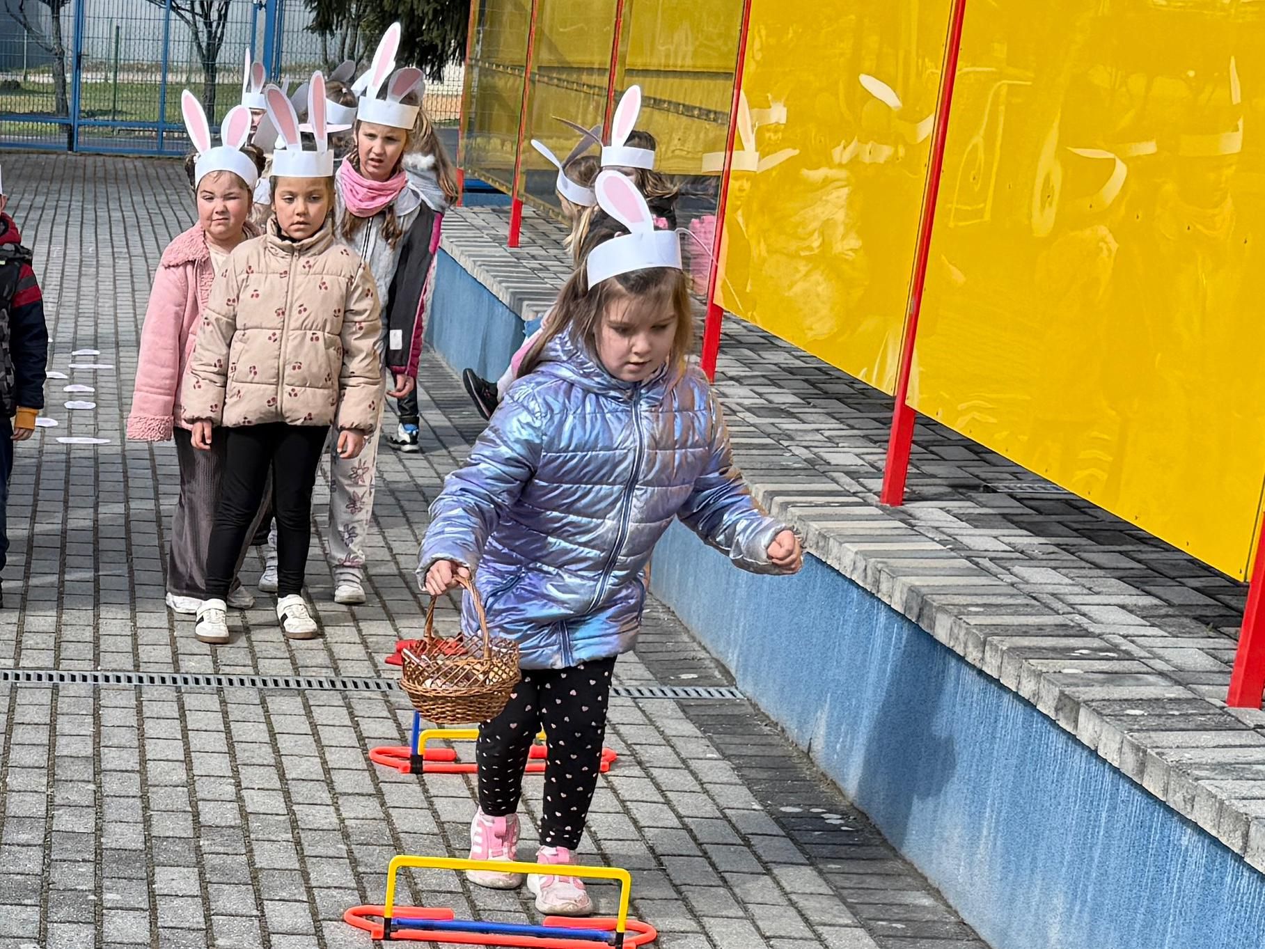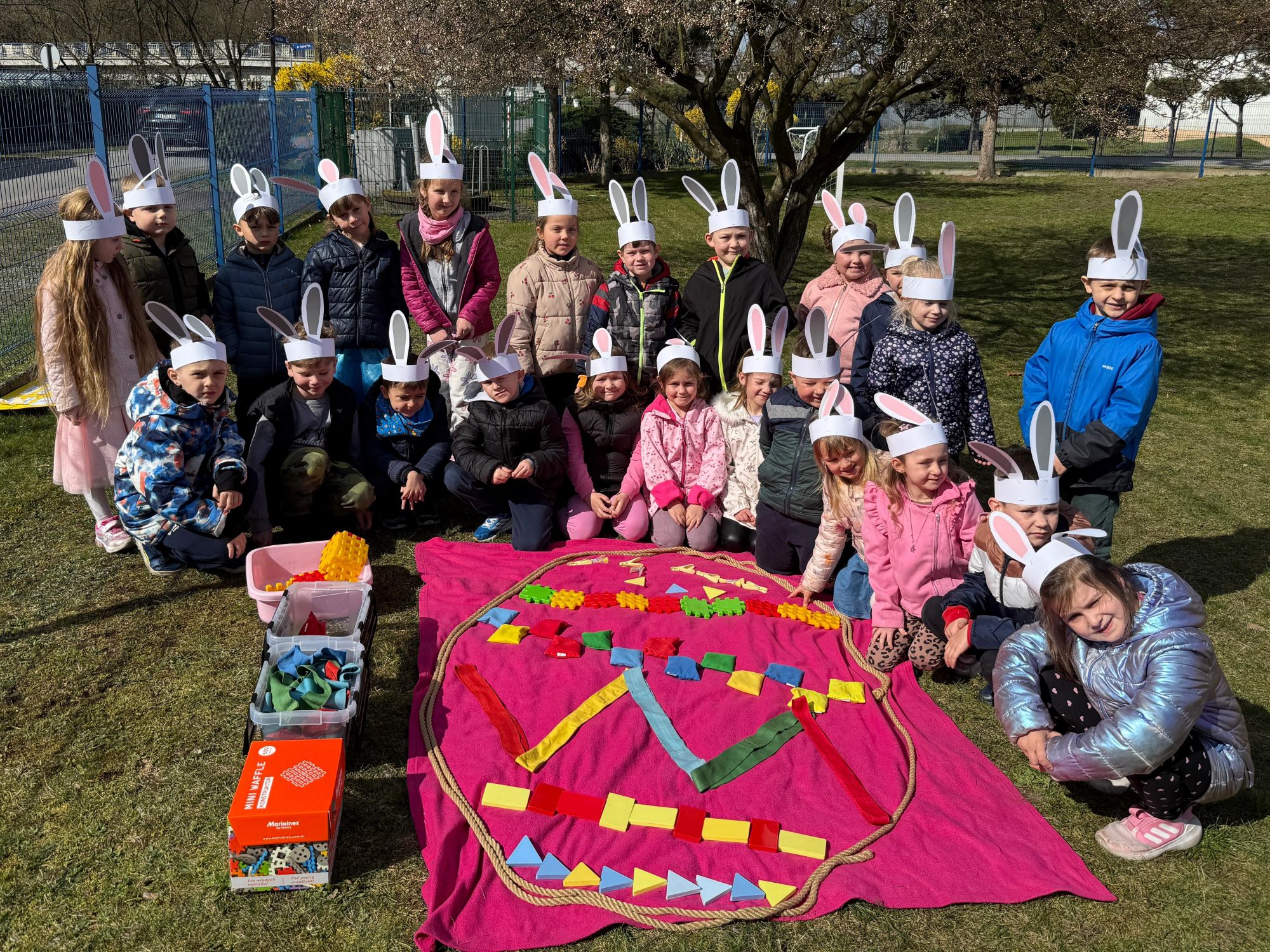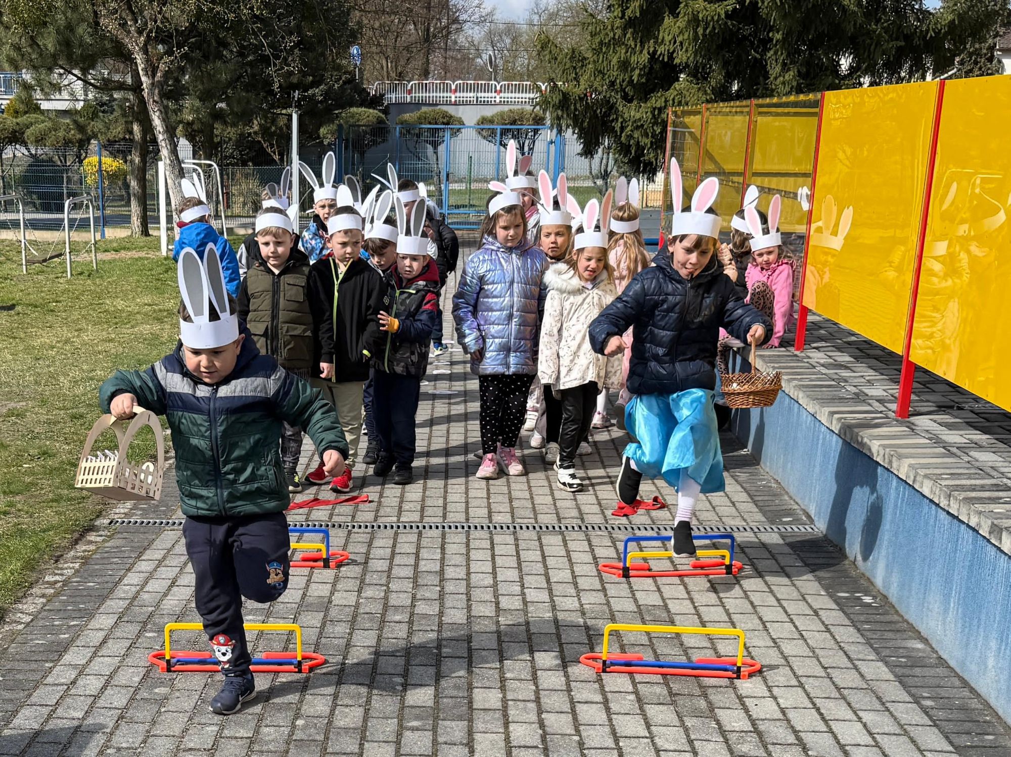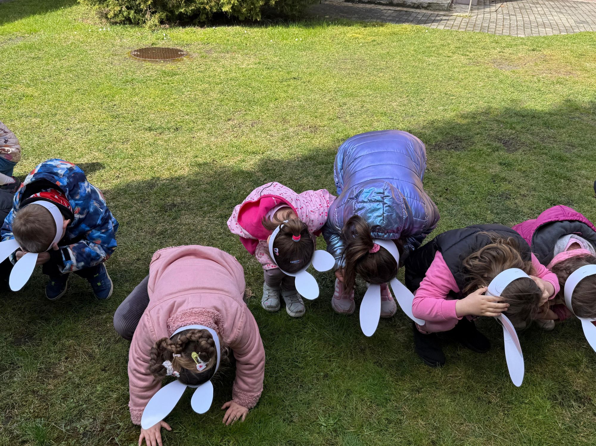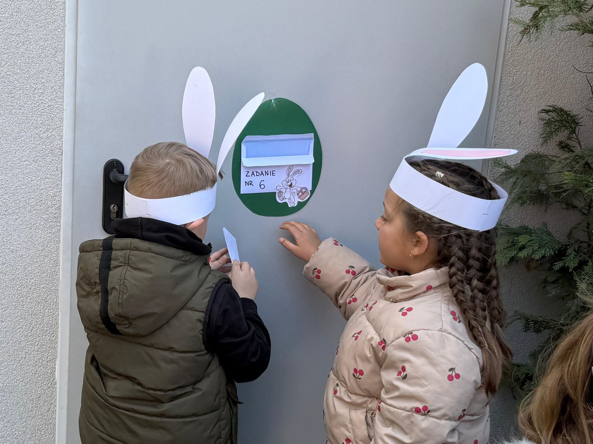 Każdego roku, tuż przed Świętami Wielkanocnymi, starszaków odwiedza wyjątkowy gość – Zajączek Wielkanocny. W tym roku, 1 kwietnia, dzieci już od samego rana z niecierpliwością wypatrywały jego przyjścia. Zaglądały przez okna i zastanawiały się, kiedy się pojawi. Po drugim śniadaniu ubrały się i założyły opaski z uszami zajączka, aby jeszcze lepiej poczuć wielkanocny nastrój. Chwilę później wyszły przed budynek przedszkola, gdzie czekała na nie niespodzianka – pięknie udekorowane wstążką pudełko oraz tajemnicza mapa. Po otwarciu pudełka przedszkolaki znalazły list, który odczytały wspólnie z panią Eweliną. Następnie rozłożyły mapę wskazującą trasę poszukiwania upominków i zgodnie z jej wskazówkami wyruszyły w drogę. Podczas wyprawy odnajdywały kolejne koperty pozostawione przez Zajączka. Z ogromnym zaangażowaniem wykonywały ukryte w nich zadania. Rozwiązywały zagadki, układały puzzle, pokonywały tory przeszkód, tworzyły wspólną pisankę z wykorzystaniem sznura, figur oraz przyborów gimnastycznych, takich jak szarfy czy woreczki. Uczestniczyły w zabawach matematycznych - przeliczały kropki na pisankach i dopasowywały do nich odpowiednie cyfry. Nie zabrakło także zabaw ruchowych, śpiewu piosenek oraz recytacji wierszy. Gdy dzieci dotarły do celu i odnalazły ostatni list, Zajączek postanowił zrobić im małego psikusa. Najpierw natrafiły na pusty koszyk z napisem „Prima Aprilis – szukajcie dalej!”. Ostatecznie udało się odnaleźć prawdziwy skarb – koszyk pełen słodkich upominków, który sprawił wszystkim ogromną radość. Poszukiwanie wskazówek okazało się doskonałą zabawą, która dostarczyła wszystkim wielu niezapomnianych wrażeń.