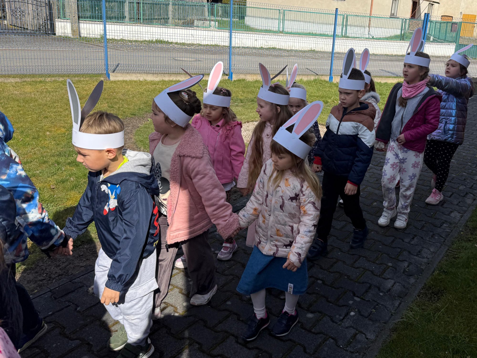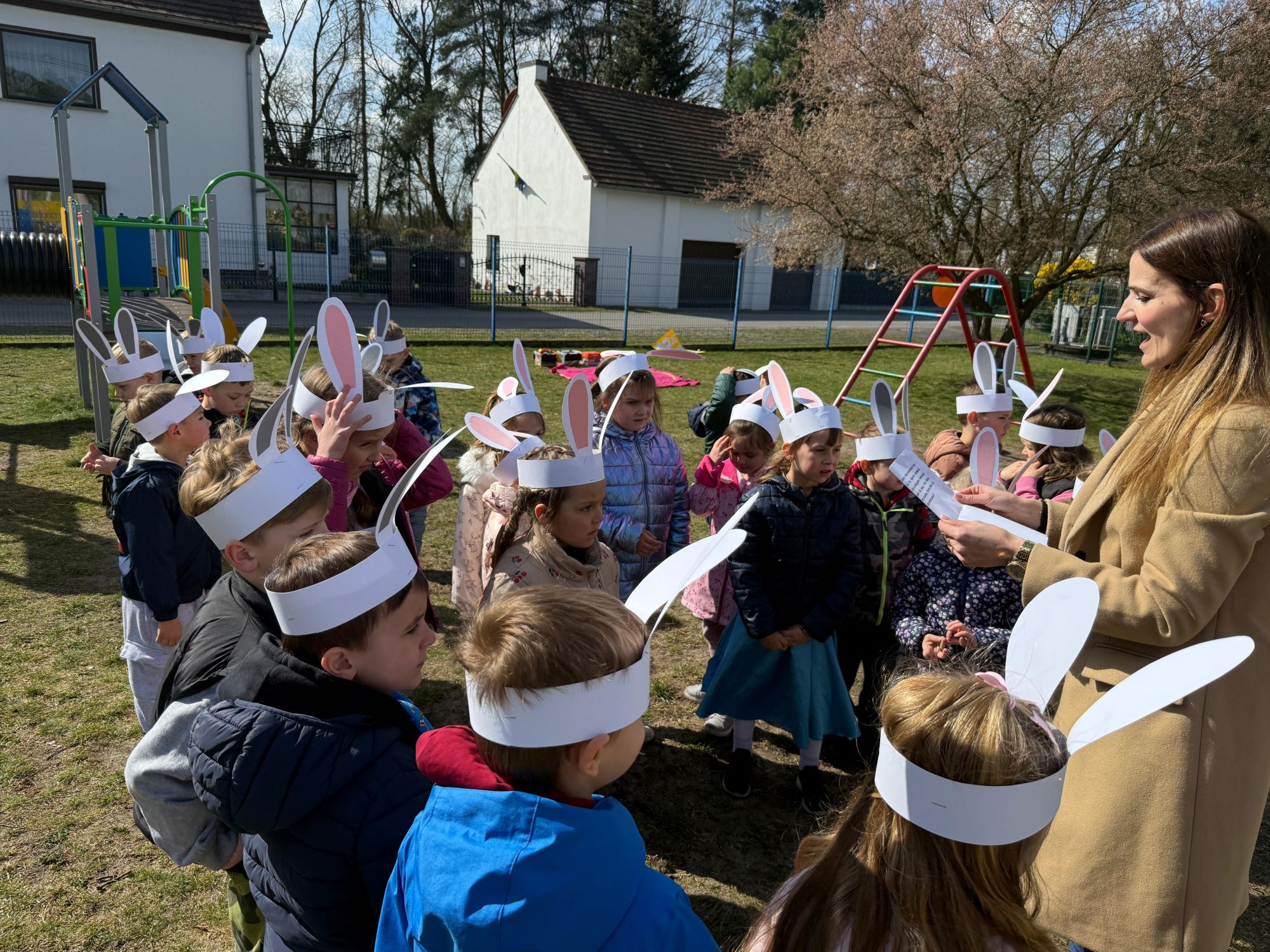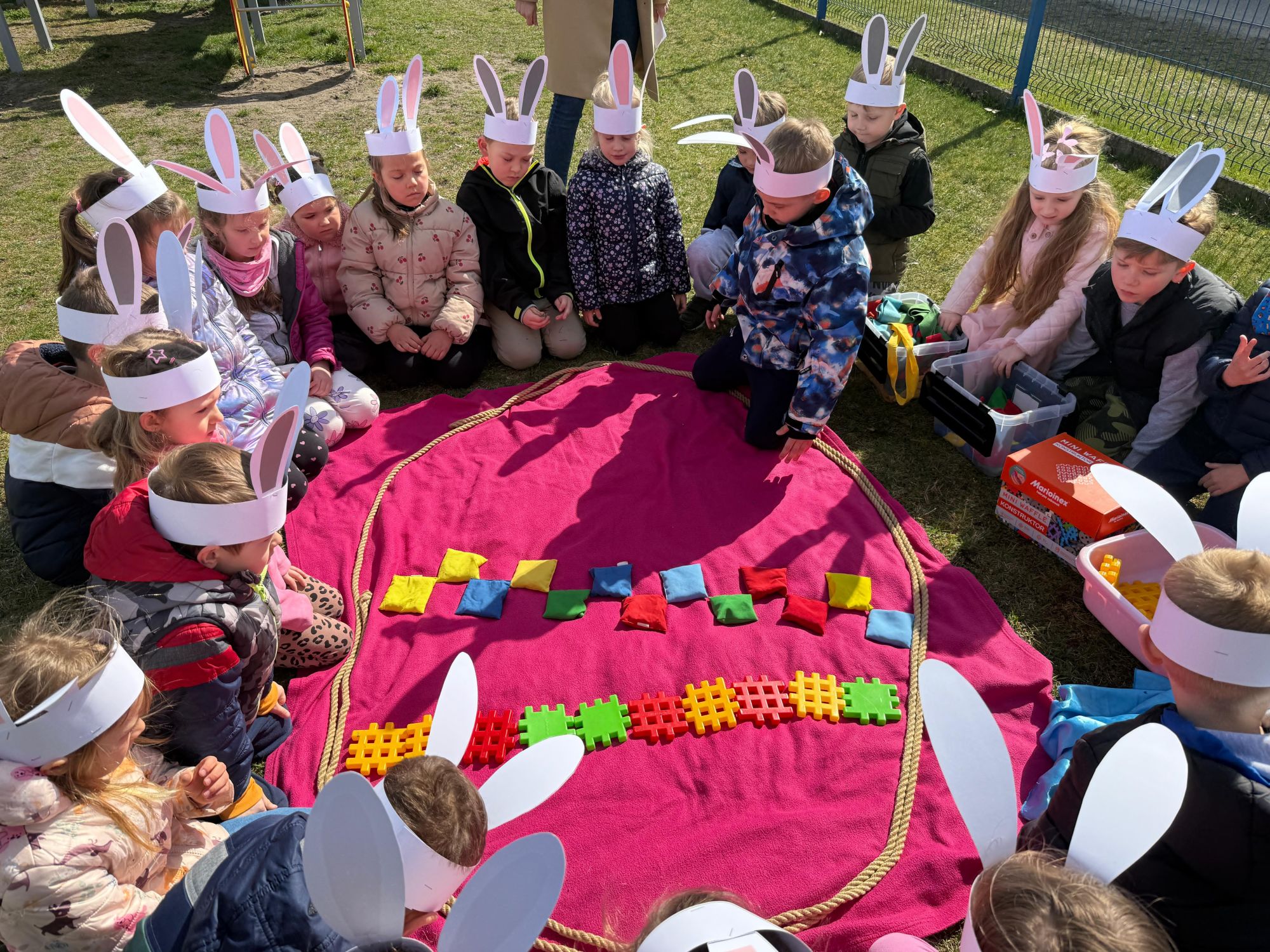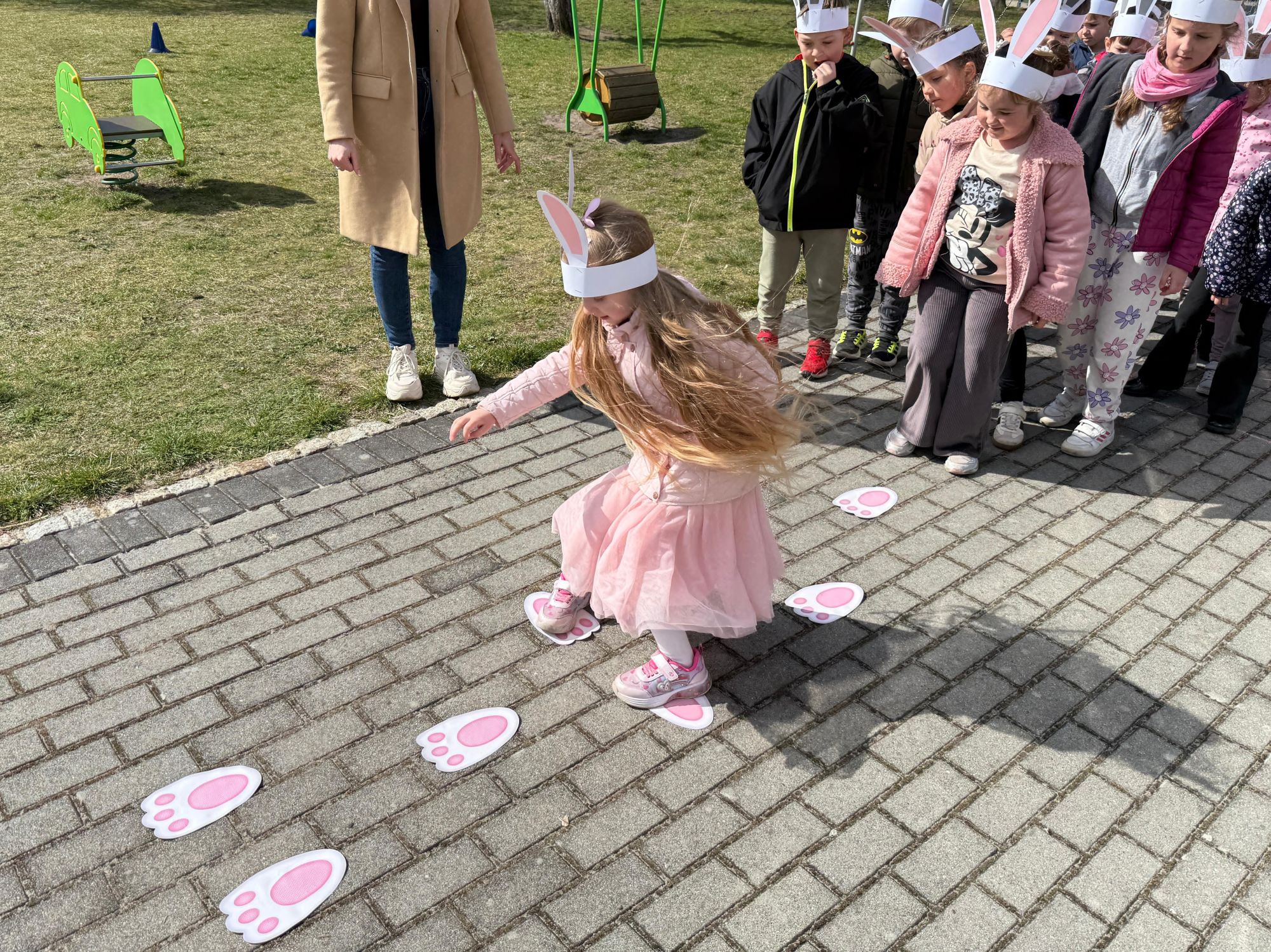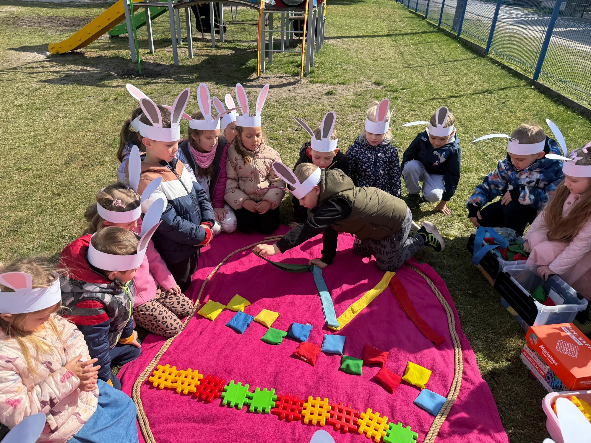 Każdego roku, tuż przed Świętami Wielkanocnymi, starszaków odwiedza wyjątkowy gość – Zajączek Wielkanocny. W tym roku, 1 kwietnia, dzieci już od samego rana z niecierpliwością wypatrywały jego przyjścia. Zaglądały przez okna i zastanawiały się, kiedy się pojawi. Po drugim śniadaniu ubrały się i założyły opaski z uszami zajączka, aby jeszcze lepiej poczuć wielkanocny nastrój. Chwilę później wyszły przed budynek przedszkola, gdzie czekała na nie niespodzianka – pięknie udekorowane wstążką pudełko oraz tajemnicza mapa. Po otwarciu pudełka przedszkolaki znalazły list, który odczytały wspólnie z panią Eweliną. Następnie rozłożyły mapę wskazującą trasę poszukiwania upominków i zgodnie z jej wskazówkami wyruszyły w drogę. Podczas wyprawy odnajdywały kolejne koperty pozostawione przez Zajączka. Z ogromnym zaangażowaniem wykonywały ukryte w nich zadania. Rozwiązywały zagadki, układały puzzle, pokonywały tory przeszkód, tworzyły wspólną pisankę z wykorzystaniem sznura, figur oraz przyborów gimnastycznych, takich jak szarfy czy woreczki. Uczestniczyły w zabawach matematycznych - przeliczały kropki na pisankach i dopasowywały do nich odpowiednie cyfry. Nie zabrakło także zabaw ruchowych, śpiewu piosenek oraz recytacji wierszy. Gdy dzieci dotarły do celu i odnalazły ostatni list, Zajączek postanowił zrobić im małego psikusa. Najpierw natrafiły na pusty koszyk z napisem „Prima Aprilis – szukajcie dalej!”. Ostatecznie udało się odnaleźć prawdziwy skarb – koszyk pełen słodkich upominków, który sprawił wszystkim ogromną radość. Poszukiwanie wskazówek okazało się doskonałą zabawą, która dostarczyła wszystkim wielu niezapomnianych wrażeń.