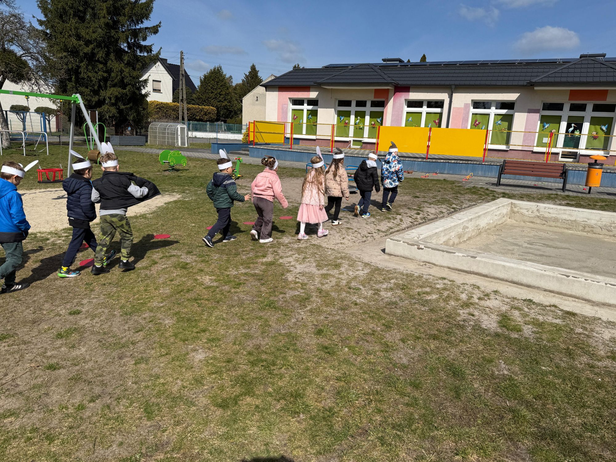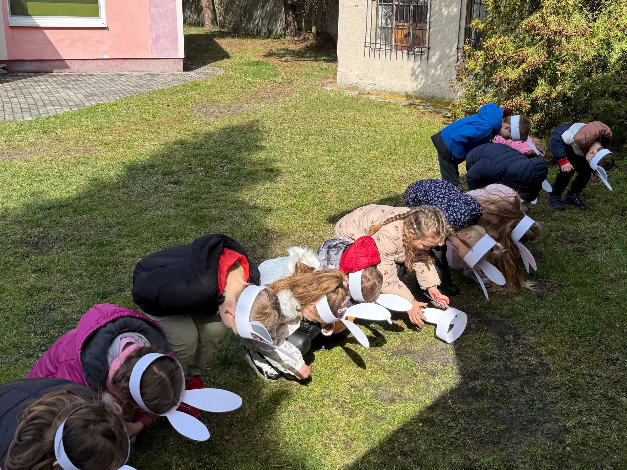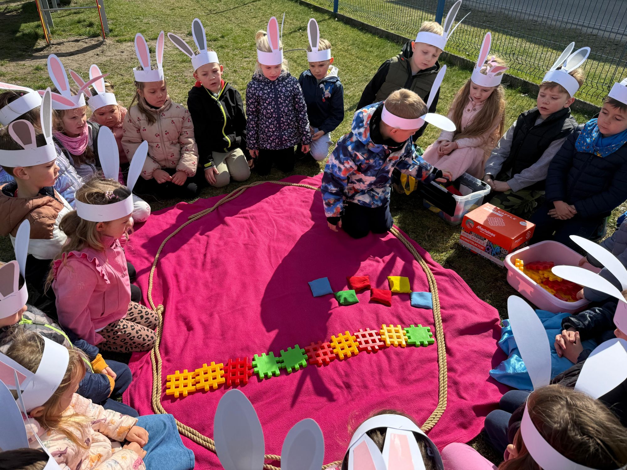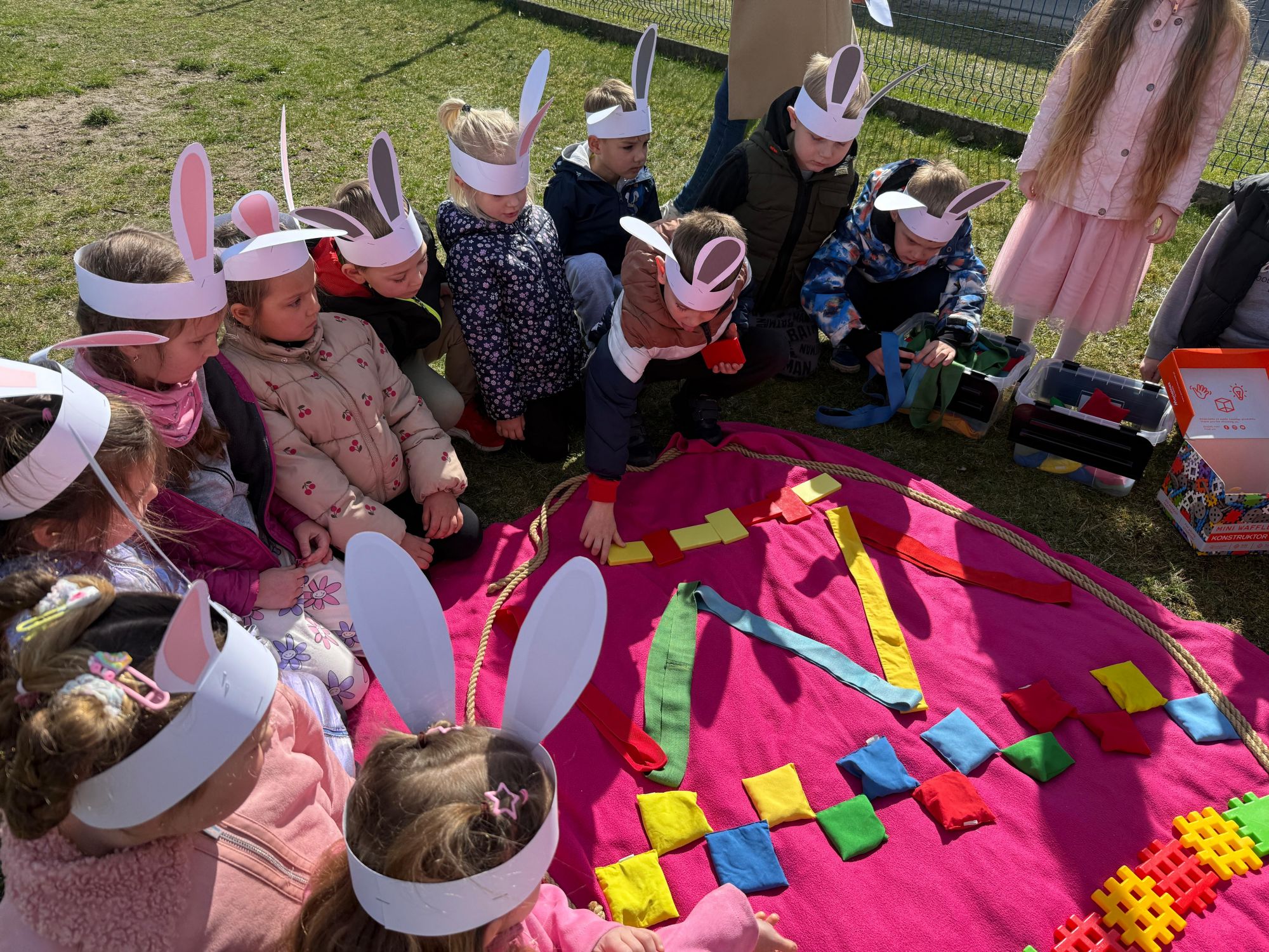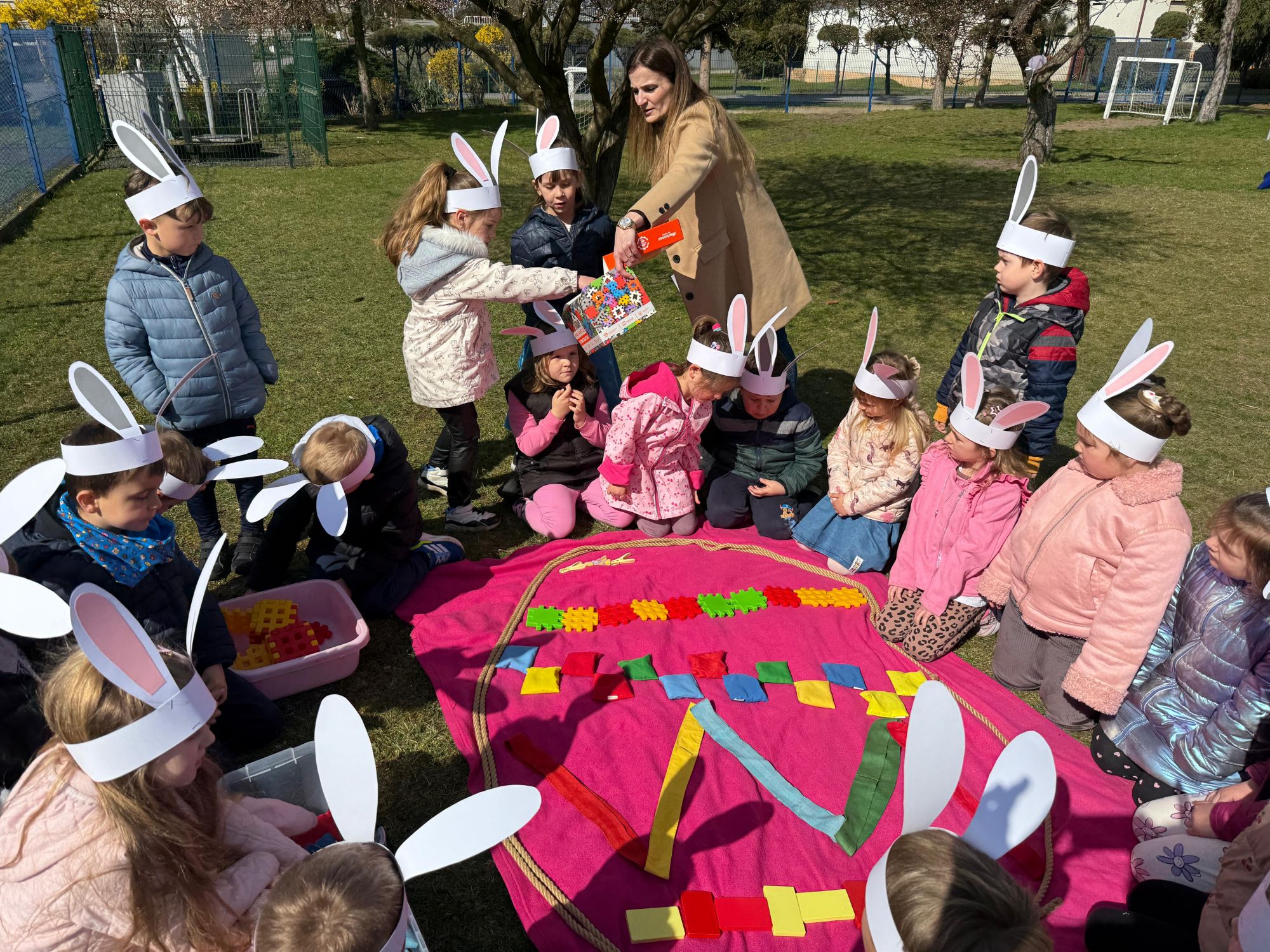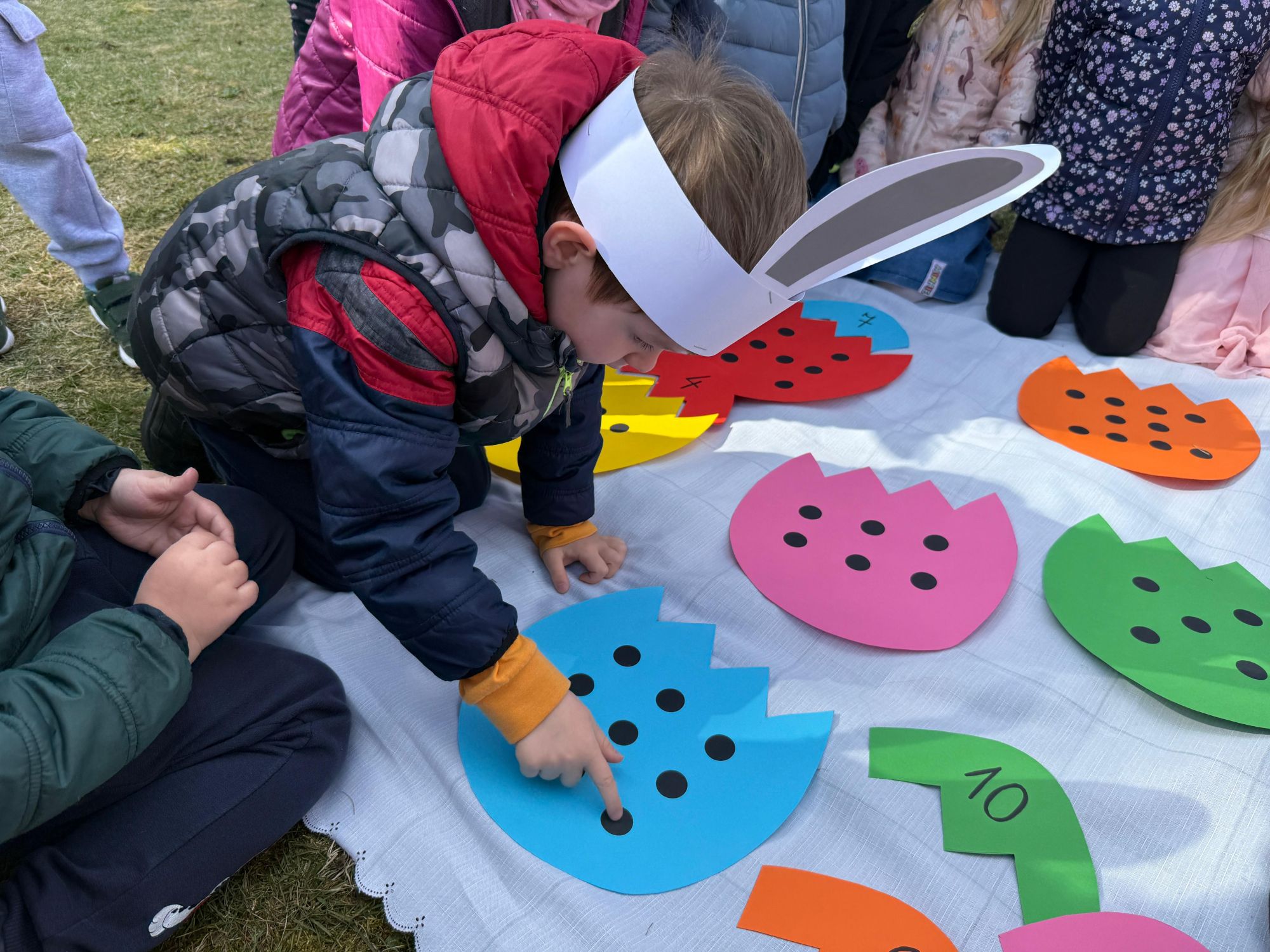 Każdego roku, tuż przed Świętami Wielkanocnymi, starszaków odwiedza wyjątkowy gość – Zajączek Wielkanocny. W tym roku, 1 kwietnia, dzieci już od samego rana z niecierpliwością wypatrywały jego przyjścia. Zaglądały przez okna i zastanawiały się, kiedy się pojawi. Po drugim śniadaniu ubrały się i założyły opaski z uszami zajączka, aby jeszcze lepiej poczuć wielkanocny nastrój. Chwilę później wyszły przed budynek przedszkola, gdzie czekała na nie niespodzianka – pięknie udekorowane wstążką pudełko oraz tajemnicza mapa. Po otwarciu pudełka przedszkolaki znalazły list, który odczytały wspólnie z panią Eweliną. Następnie rozłożyły mapę wskazującą trasę poszukiwania upominków i zgodnie z jej wskazówkami wyruszyły w drogę. Podczas wyprawy odnajdywały kolejne koperty pozostawione przez Zajączka. Z ogromnym zaangażowaniem wykonywały ukryte w nich zadania. Rozwiązywały zagadki, układały puzzle, pokonywały tory przeszkód, tworzyły wspólną pisankę z wykorzystaniem sznura, figur oraz przyborów gimnastycznych, takich jak szarfy czy woreczki. Uczestniczyły w zabawach matematycznych - przeliczały kropki na pisankach i dopasowywały do nich odpowiednie cyfry. Nie zabrakło także zabaw ruchowych, śpiewu piosenek oraz recytacji wierszy. Gdy dzieci dotarły do celu i odnalazły ostatni list, Zajączek postanowił zrobić im małego psikusa. Najpierw natrafiły na pusty koszyk z napisem „Prima Aprilis – szukajcie dalej!”. Ostatecznie udało się odnaleźć prawdziwy skarb – koszyk pełen słodkich upominków, który sprawił wszystkim ogromną radość. Poszukiwanie wskazówek okazało się doskonałą zabawą, która dostarczyła wszystkim wielu niezapomnianych wrażeń.