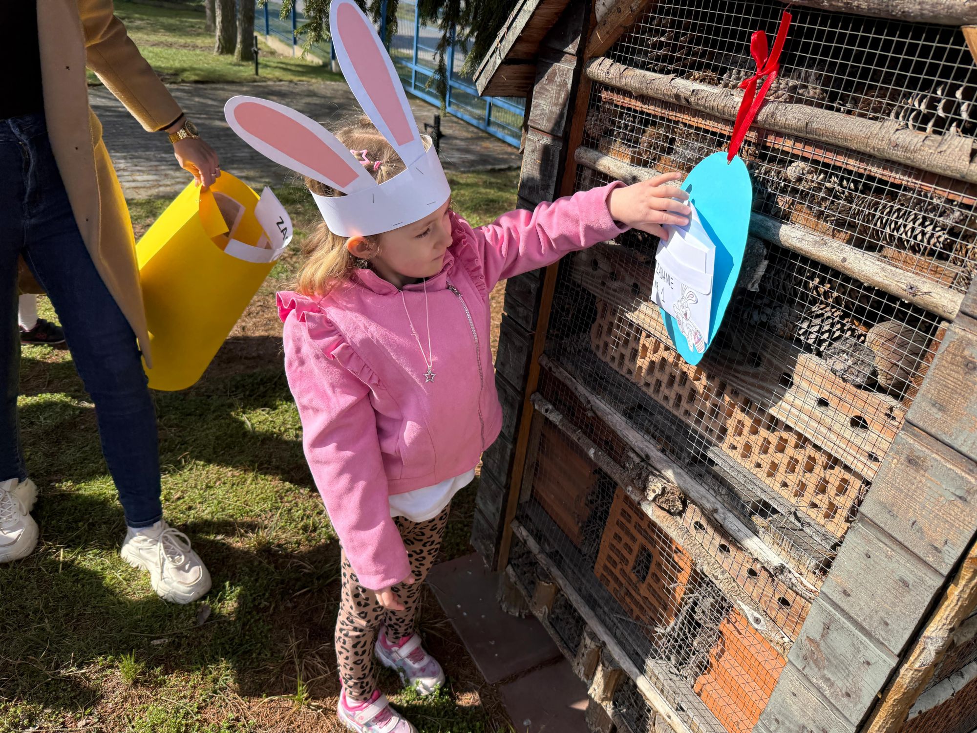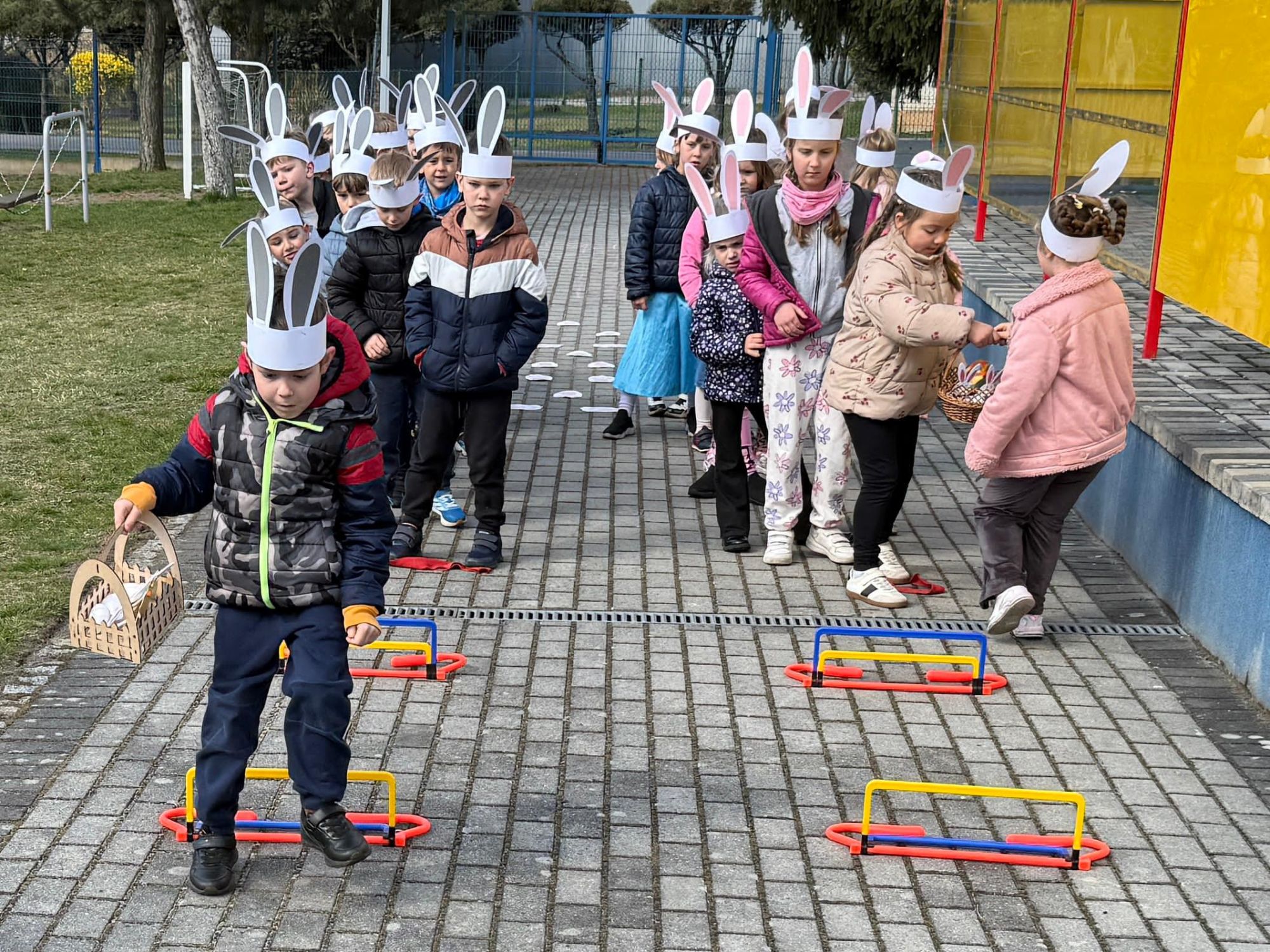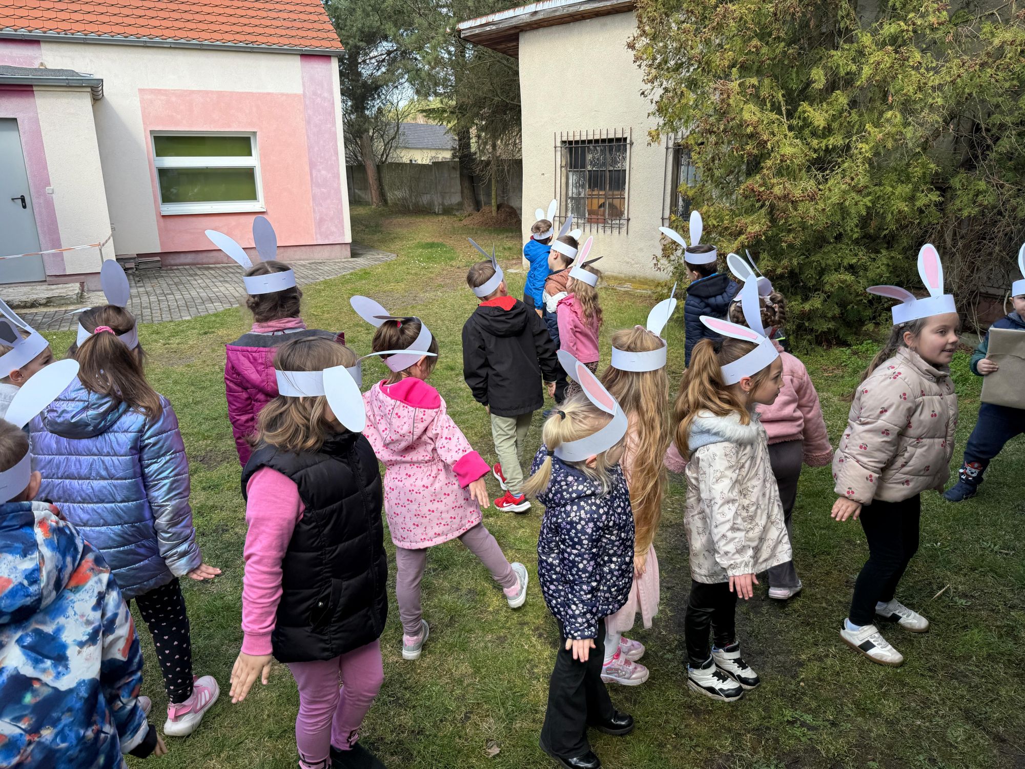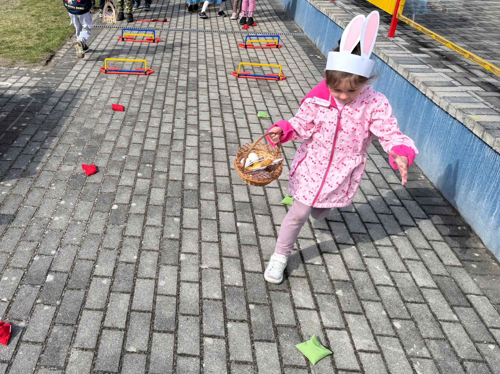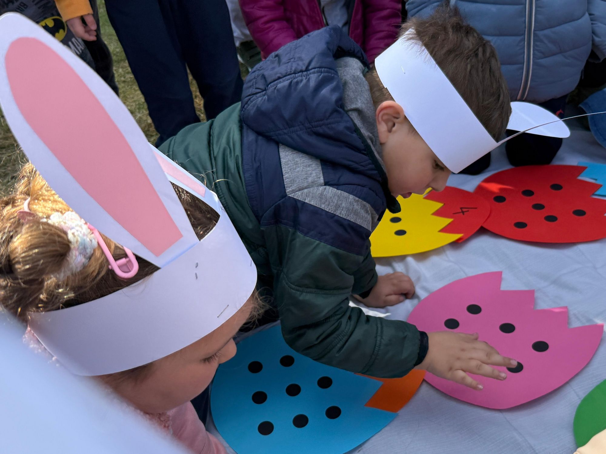 Każdego roku, tuż przed Świętami Wielkanocnymi, starszaków odwiedza wyjątkowy gość – Zajączek Wielkanocny. W tym roku, 1 kwietnia, dzieci już od samego rana z niecierpliwością wypatrywały jego przyjścia. Zaglądały przez okna i zastanawiały się, kiedy się pojawi. Po drugim śniadaniu ubrały się i założyły opaski z uszami zajączka, aby jeszcze lepiej poczuć wielkanocny nastrój. Chwilę później wyszły przed budynek przedszkola, gdzie czekała na nie niespodzianka – pięknie udekorowane wstążką pudełko oraz tajemnicza mapa. Po otwarciu pudełka przedszkolaki znalazły list, który odczytały wspólnie z panią Eweliną. Następnie rozłożyły mapę wskazującą trasę poszukiwania upominków i zgodnie z jej wskazówkami wyruszyły w drogę. Podczas wyprawy odnajdywały kolejne koperty pozostawione przez Zajączka. Z ogromnym zaangażowaniem wykonywały ukryte w nich zadania. Rozwiązywały zagadki, układały puzzle, pokonywały tory przeszkód, tworzyły wspólną pisankę z wykorzystaniem sznura, figur oraz przyborów gimnastycznych, takich jak szarfy czy woreczki. Uczestniczyły w zabawach matematycznych - przeliczały kropki na pisankach i dopasowywały do nich odpowiednie cyfry. Nie zabrakło także zabaw ruchowych, śpiewu piosenek oraz recytacji wierszy. Gdy dzieci dotarły do celu i odnalazły ostatni list, Zajączek postanowił zrobić im małego psikusa. Najpierw natrafiły na pusty koszyk z napisem „Prima Aprilis – szukajcie dalej!”. Ostatecznie udało się odnaleźć prawdziwy skarb – koszyk pełen słodkich upominków, który sprawił wszystkim ogromną radość. Poszukiwanie wskazówek okazało się doskonałą zabawą, która dostarczyła wszystkim wielu niezapomnianych wrażeń.