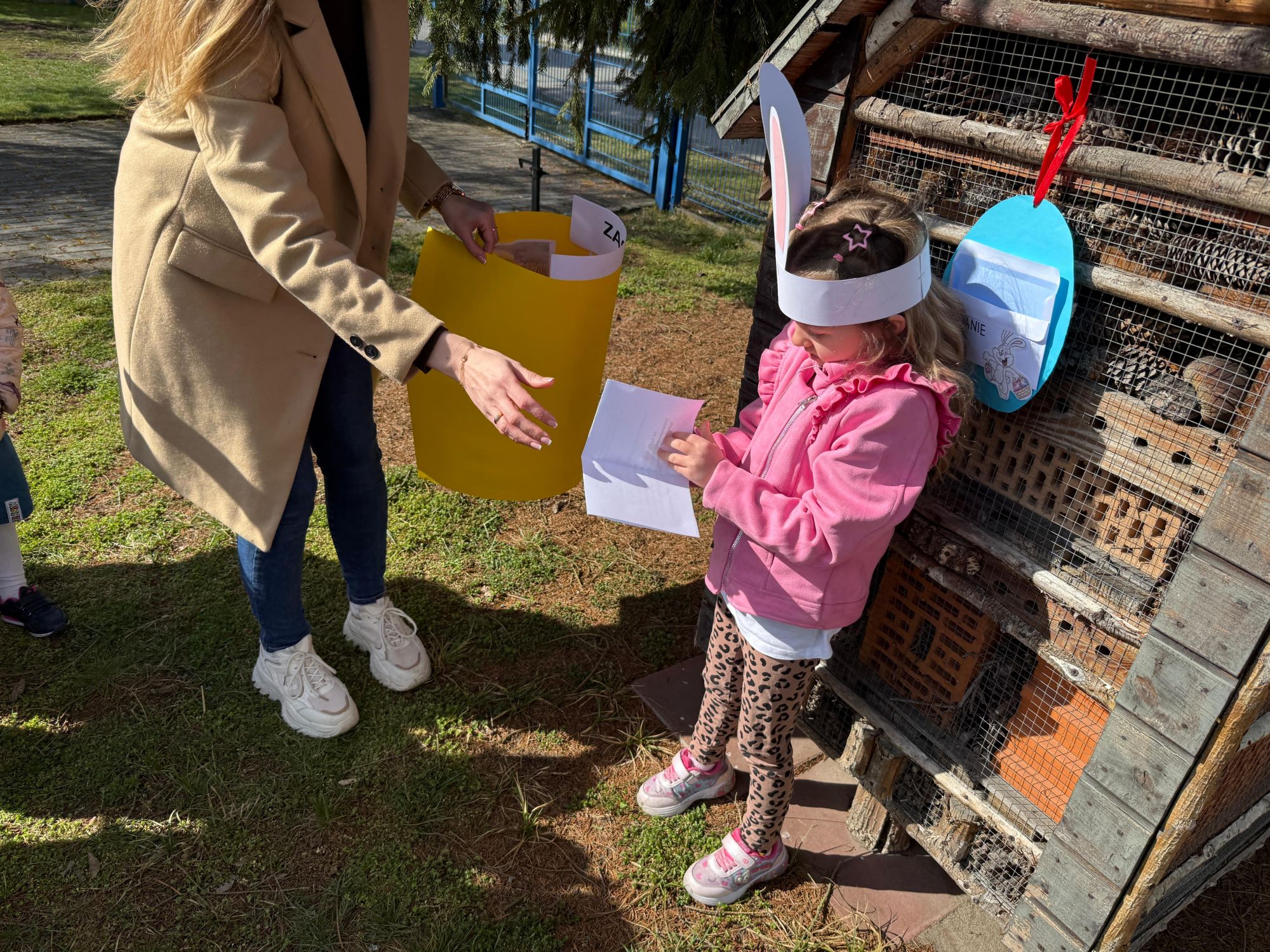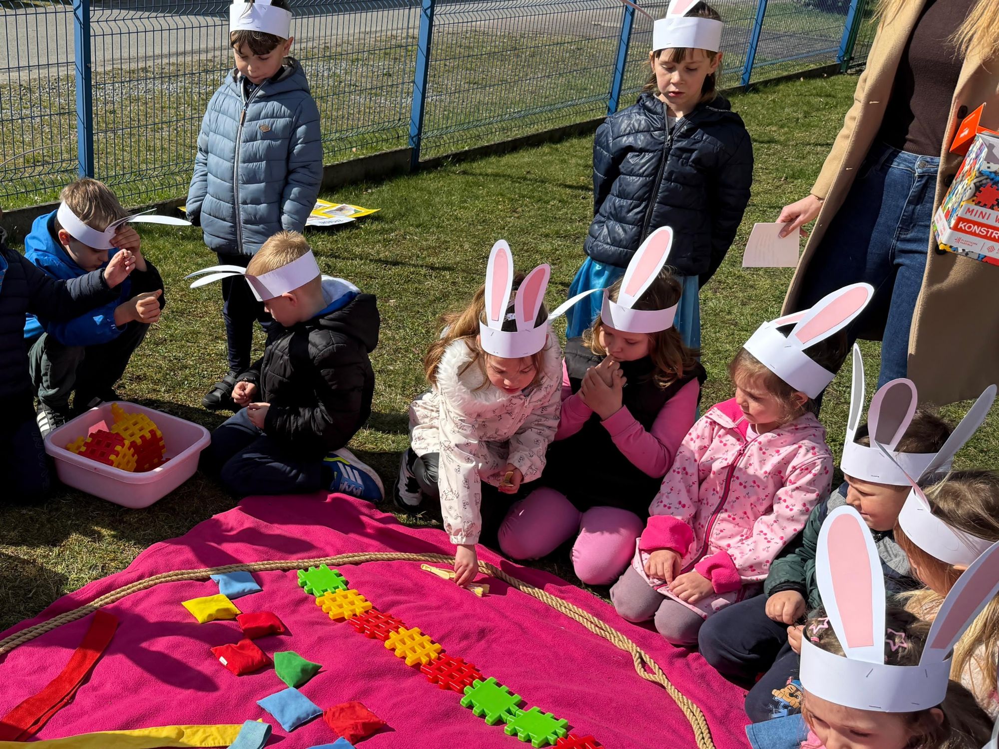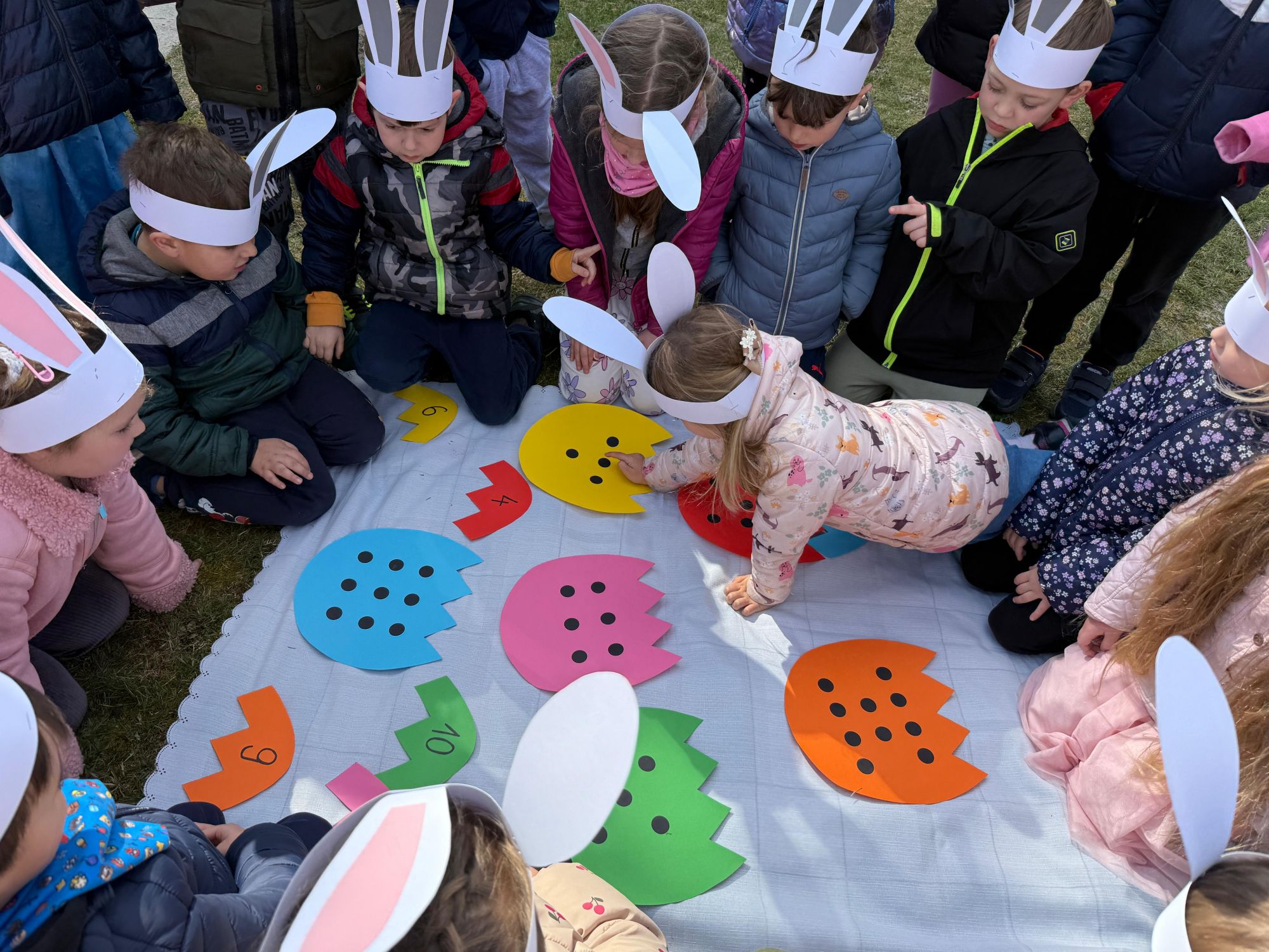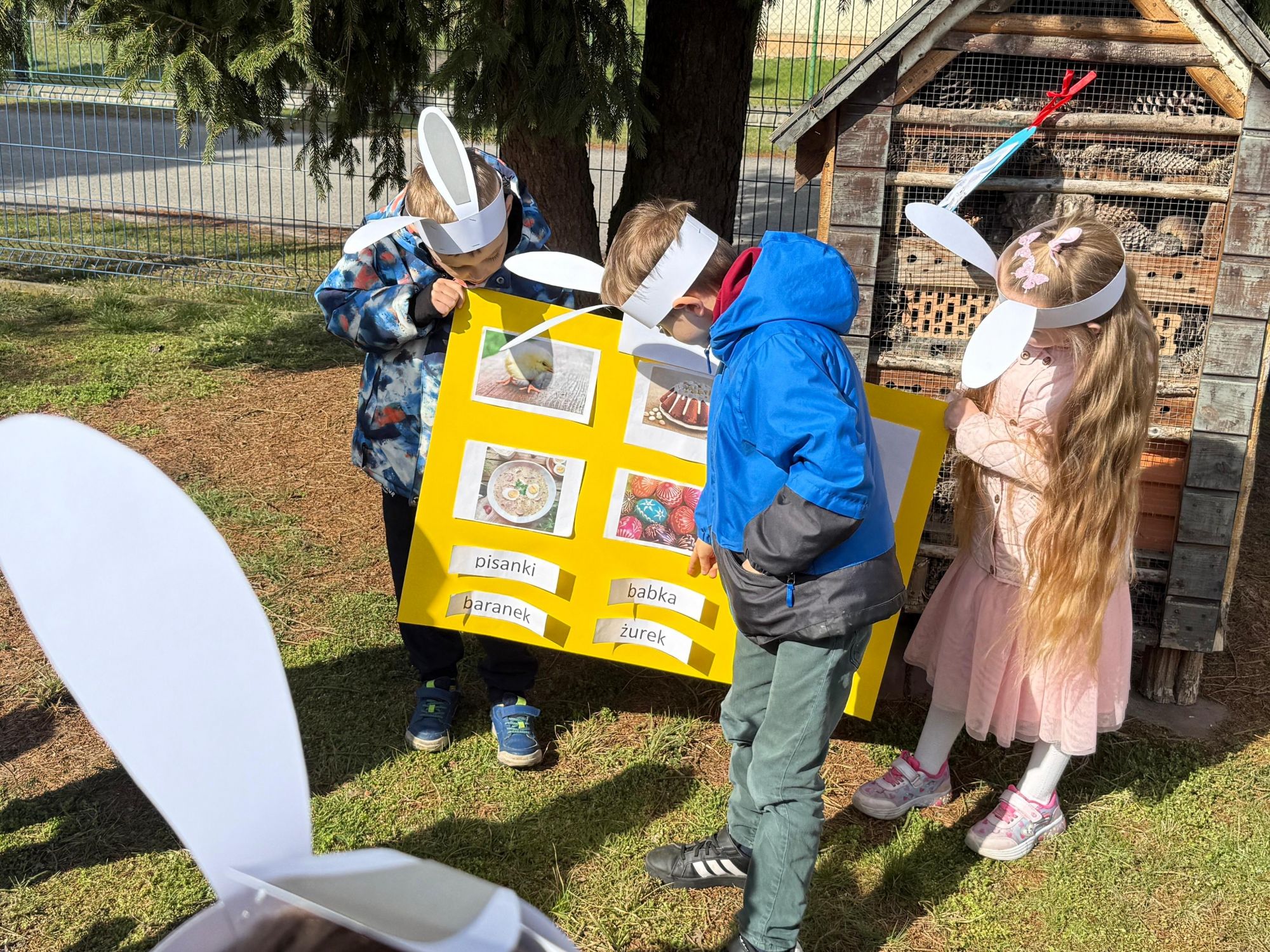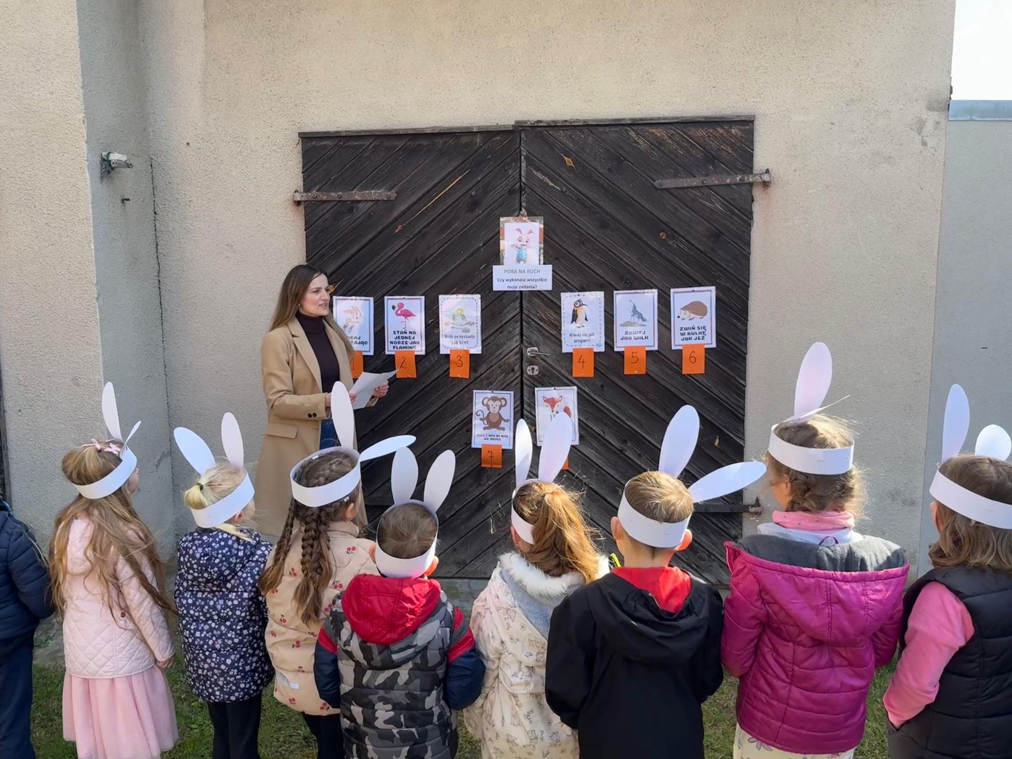 Każdego roku, tuż przed Świętami Wielkanocnymi, starszaków odwiedza wyjątkowy gość – Zajączek Wielkanocny. W tym roku, 1 kwietnia, dzieci już od samego rana z niecierpliwością wypatrywały jego przyjścia. Zaglądały przez okna i zastanawiały się, kiedy się pojawi. Po drugim śniadaniu ubrały się i założyły opaski z uszami zajączka, aby jeszcze lepiej poczuć wielkanocny nastrój. Chwilę później wyszły przed budynek przedszkola, gdzie czekała na nie niespodzianka – pięknie udekorowane wstążką pudełko oraz tajemnicza mapa. Po otwarciu pudełka przedszkolaki znalazły list, który odczytały wspólnie z panią Eweliną. Następnie rozłożyły mapę wskazującą trasę poszukiwania upominków i zgodnie z jej wskazówkami wyruszyły w drogę. Podczas wyprawy odnajdywały kolejne koperty pozostawione przez Zajączka. Z ogromnym zaangażowaniem wykonywały ukryte w nich zadania. Rozwiązywały zagadki, układały puzzle, pokonywały tory przeszkód, tworzyły wspólną pisankę z wykorzystaniem sznura, figur oraz przyborów gimnastycznych, takich jak szarfy czy woreczki. Uczestniczyły w zabawach matematycznych - przeliczały kropki na pisankach i dopasowywały do nich odpowiednie cyfry. Nie zabrakło także zabaw ruchowych, śpiewu piosenek oraz recytacji wierszy. Gdy dzieci dotarły do celu i odnalazły ostatni list, Zajączek postanowił zrobić im małego psikusa. Najpierw natrafiły na pusty koszyk z napisem „Prima Aprilis – szukajcie dalej!”. Ostatecznie udało się odnaleźć prawdziwy skarb – koszyk pełen słodkich upominków, który sprawił wszystkim ogromną radość. Poszukiwanie wskazówek okazało się doskonałą zabawą, która dostarczyła wszystkim wielu niezapomnianych wrażeń.