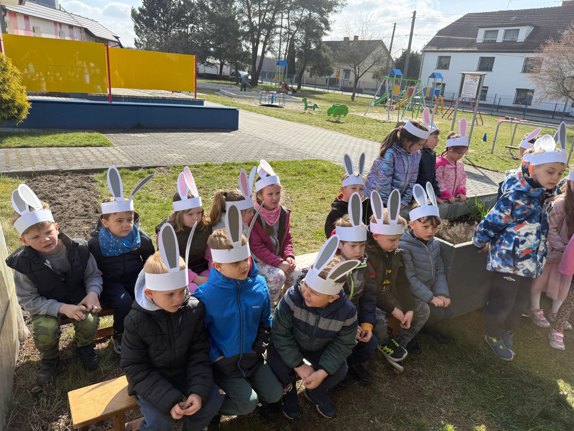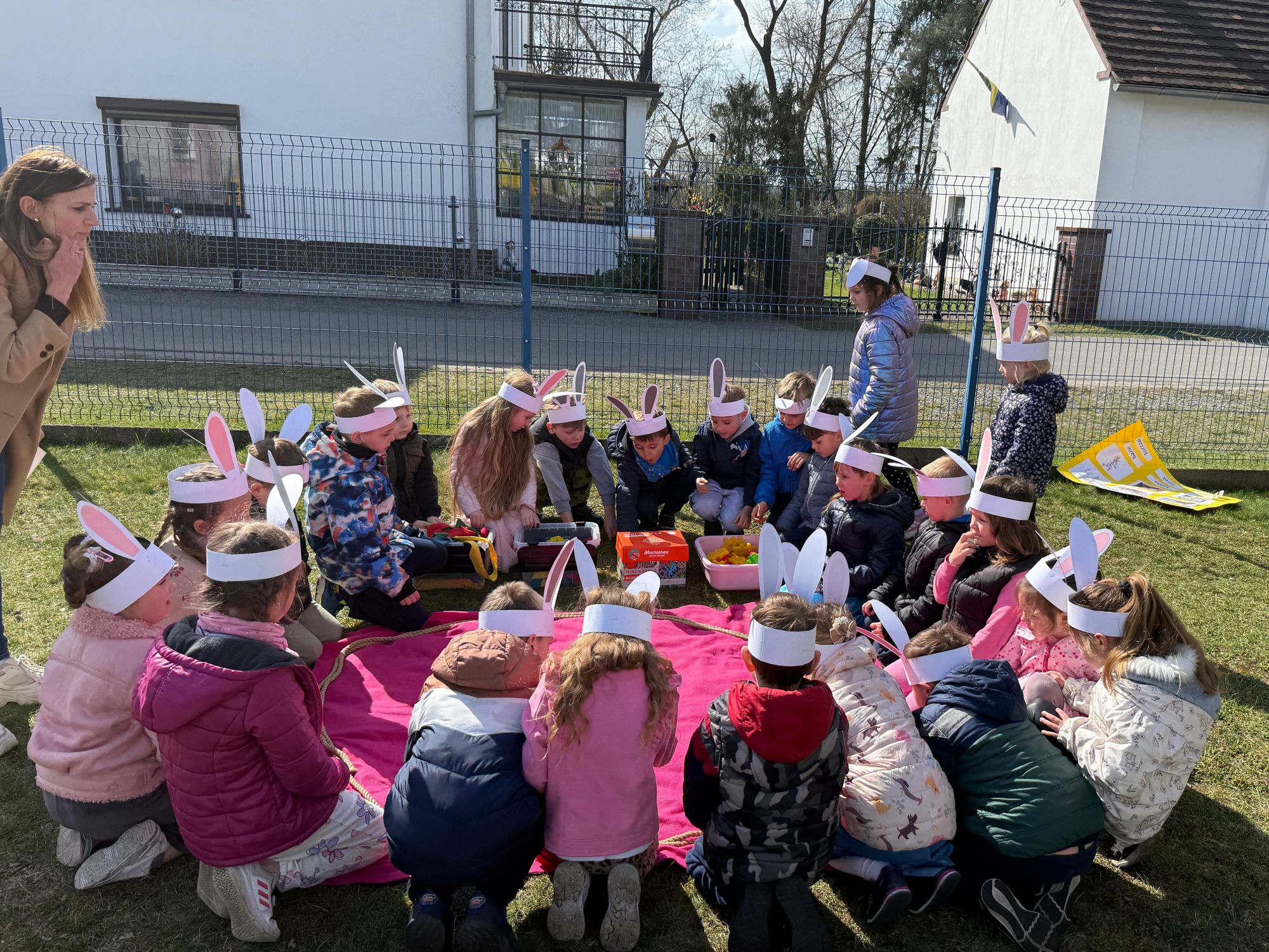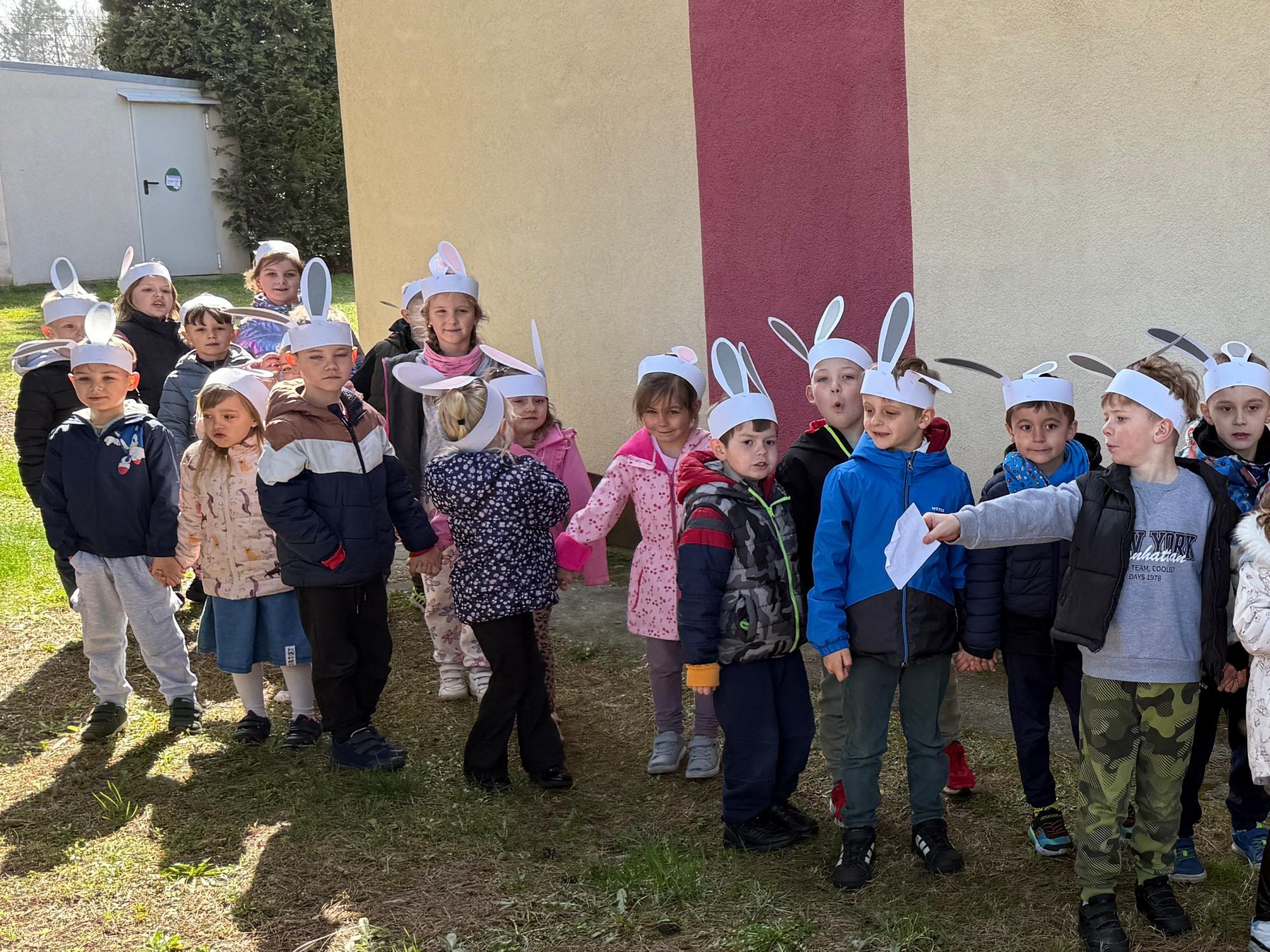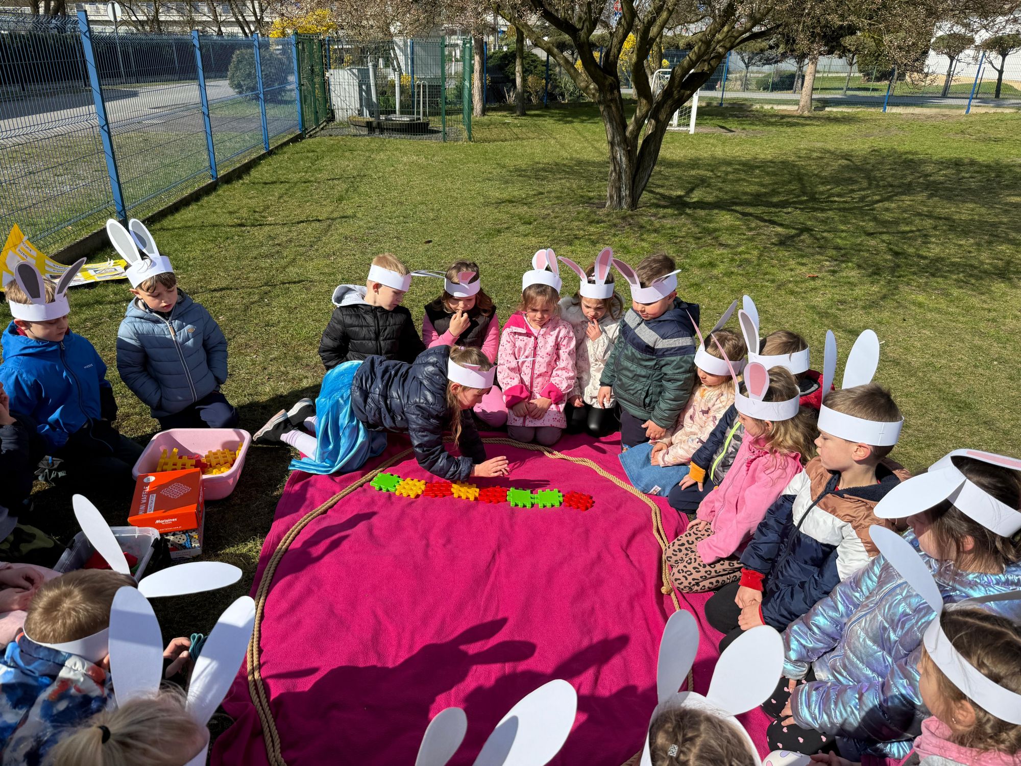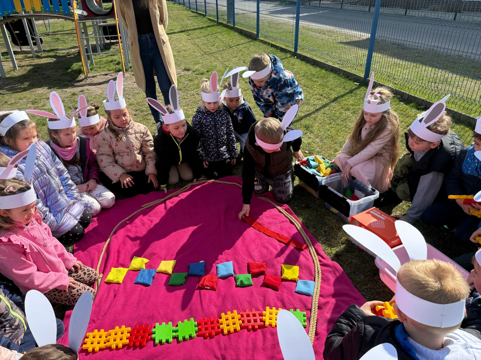 Każdego roku, tuż przed Świętami Wielkanocnymi, starszaków odwiedza wyjątkowy gość – Zajączek Wielkanocny. W tym roku, 1 kwietnia, dzieci już od samego rana z niecierpliwością wypatrywały jego przyjścia. Zaglądały przez okna i zastanawiały się, kiedy się pojawi. Po drugim śniadaniu ubrały się i założyły opaski z uszami zajączka, aby jeszcze lepiej poczuć wielkanocny nastrój. Chwilę później wyszły przed budynek przedszkola, gdzie czekała na nie niespodzianka – pięknie udekorowane wstążką pudełko oraz tajemnicza mapa. Po otwarciu pudełka przedszkolaki znalazły list, który odczytały wspólnie z panią Eweliną. Następnie rozłożyły mapę wskazującą trasę poszukiwania upominków i zgodnie z jej wskazówkami wyruszyły w drogę. Podczas wyprawy odnajdywały kolejne koperty pozostawione przez Zajączka. Z ogromnym zaangażowaniem wykonywały ukryte w nich zadania. Rozwiązywały zagadki, układały puzzle, pokonywały tory przeszkód, tworzyły wspólną pisankę z wykorzystaniem sznura, figur oraz przyborów gimnastycznych, takich jak szarfy czy woreczki. Uczestniczyły w zabawach matematycznych - przeliczały kropki na pisankach i dopasowywały do nich odpowiednie cyfry. Nie zabrakło także zabaw ruchowych, śpiewu piosenek oraz recytacji wierszy. Gdy dzieci dotarły do celu i odnalazły ostatni list, Zajączek postanowił zrobić im małego psikusa. Najpierw natrafiły na pusty koszyk z napisem „Prima Aprilis – szukajcie dalej!”. Ostatecznie udało się odnaleźć prawdziwy skarb – koszyk pełen słodkich upominków, który sprawił wszystkim ogromną radość. Poszukiwanie wskazówek okazało się doskonałą zabawą, która dostarczyła wszystkim wielu niezapomnianych wrażeń.