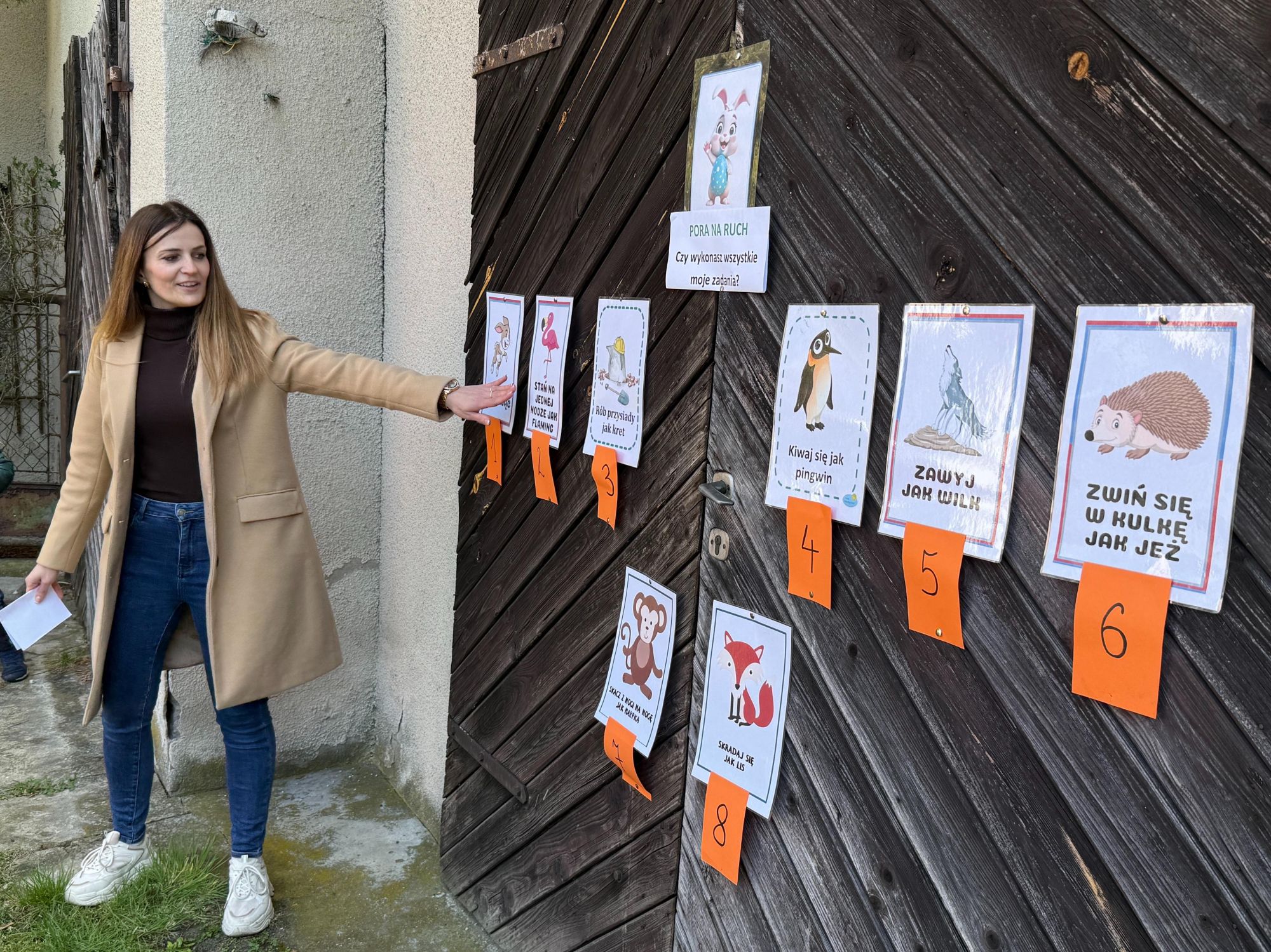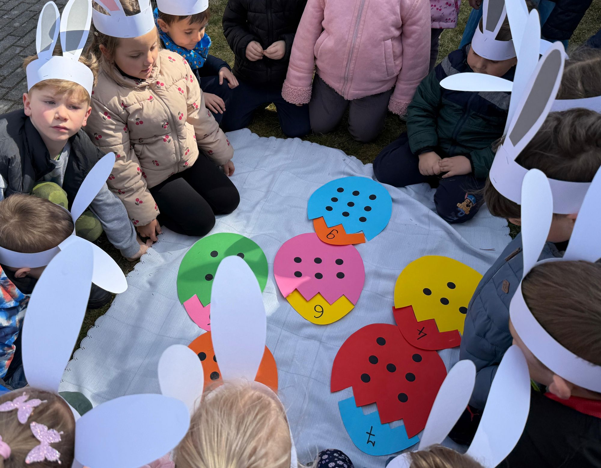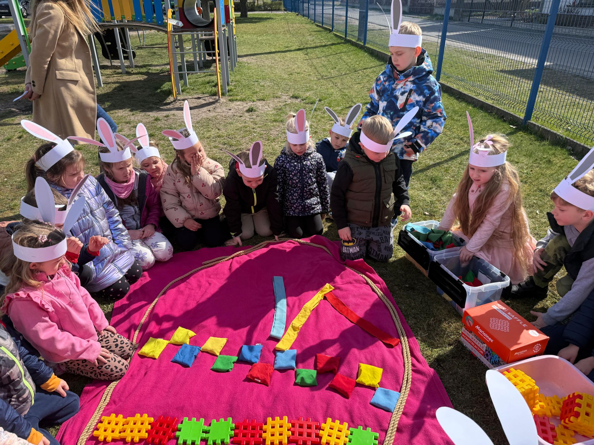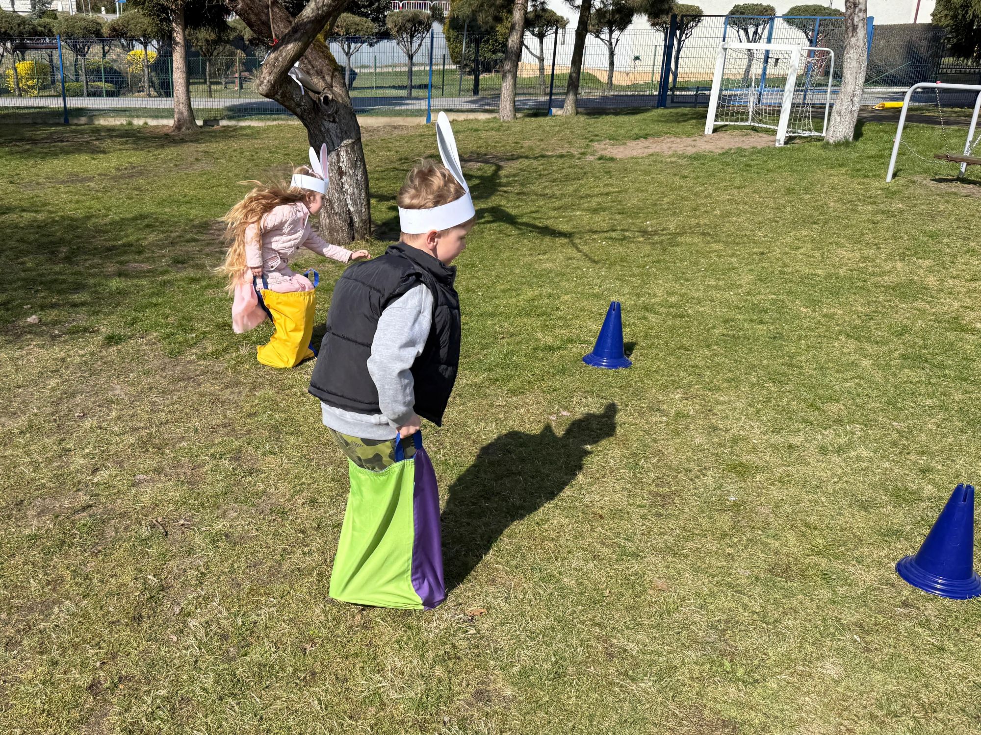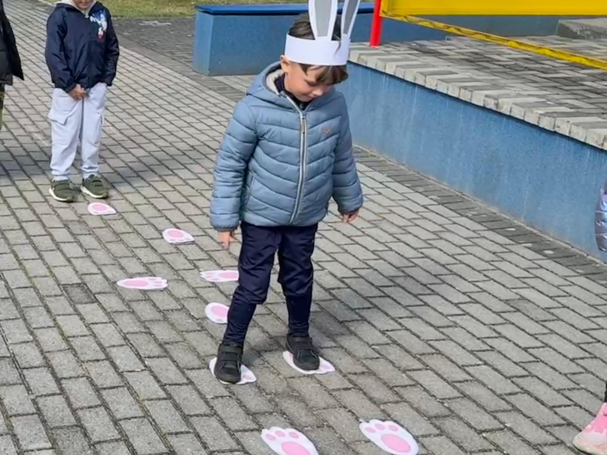 Każdego roku, tuż przed Świętami Wielkanocnymi, starszaków odwiedza wyjątkowy gość – Zajączek Wielkanocny. W tym roku, 1 kwietnia, dzieci już od samego rana z niecierpliwością wypatrywały jego przyjścia. Zaglądały przez okna i zastanawiały się, kiedy się pojawi. Po drugim śniadaniu ubrały się i założyły opaski z uszami zajączka, aby jeszcze lepiej poczuć wielkanocny nastrój. Chwilę później wyszły przed budynek przedszkola, gdzie czekała na nie niespodzianka – pięknie udekorowane wstążką pudełko oraz tajemnicza mapa. Po otwarciu pudełka przedszkolaki znalazły list, który odczytały wspólnie z panią Eweliną. Następnie rozłożyły mapę wskazującą trasę poszukiwania upominków i zgodnie z jej wskazówkami wyruszyły w drogę. Podczas wyprawy odnajdywały kolejne koperty pozostawione przez Zajączka. Z ogromnym zaangażowaniem wykonywały ukryte w nich zadania. Rozwiązywały zagadki, układały puzzle, pokonywały tory przeszkód, tworzyły wspólną pisankę z wykorzystaniem sznura, figur oraz przyborów gimnastycznych, takich jak szarfy czy woreczki. Uczestniczyły w zabawach matematycznych - przeliczały kropki na pisankach i dopasowywały do nich odpowiednie cyfry. Nie zabrakło także zabaw ruchowych, śpiewu piosenek oraz recytacji wierszy. Gdy dzieci dotarły do celu i odnalazły ostatni list, Zajączek postanowił zrobić im małego psikusa. Najpierw natrafiły na pusty koszyk z napisem „Prima Aprilis – szukajcie dalej!”. Ostatecznie udało się odnaleźć prawdziwy skarb – koszyk pełen słodkich upominków, który sprawił wszystkim ogromną radość. Poszukiwanie wskazówek okazało się doskonałą zabawą, która dostarczyła wszystkim wielu niezapomnianych wrażeń.